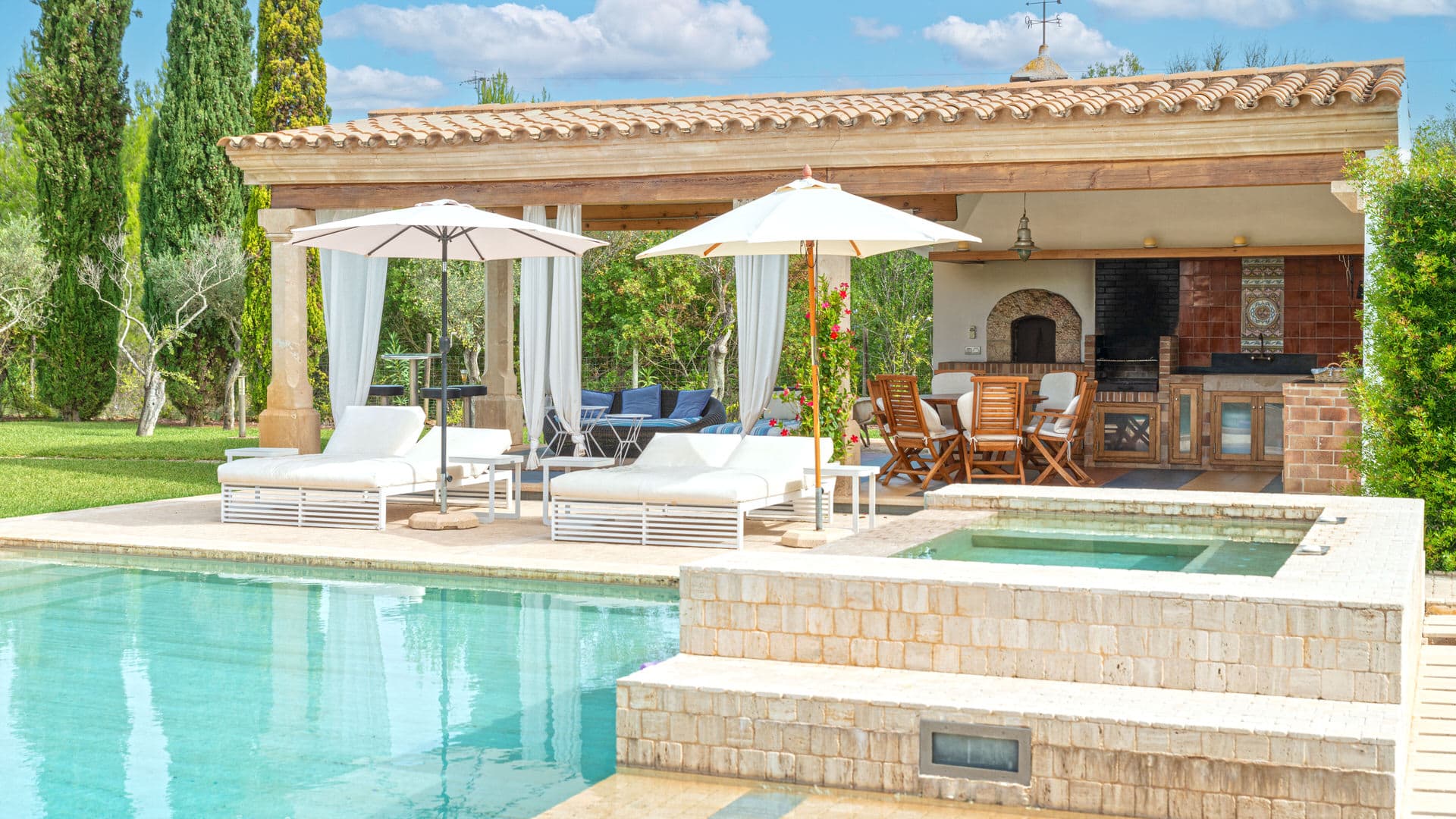 The huge pool is nestled in a wonderful typical Mediterranean garden with adjoining pergola with outdoor kitchen and dining area. A parking space for several vehicles and a jacuzzi complete this offer.