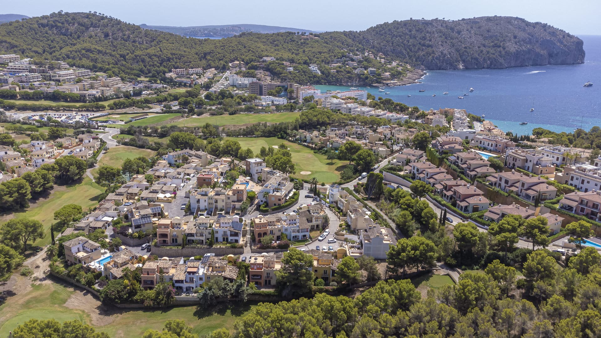 Lage: This superb property is located in a desirable residential area of Camp de Mar in the southwest of Mallorca. The area is particularly quiet and the residents escape, despite some high-priced hotels such as the Steigenberger Hotel, the large tourist groups in the summer. The pretty seaside resort, located directly between Puerto Andratx and Peguera, boasts exquisite restaurants and a particularly fine sandy beach, which is especially popular with families thanks to free parking and a shallow bay. An on-site golf course and the proximity to the lively port city of Port d'Andratx make this residential area very desirable.
