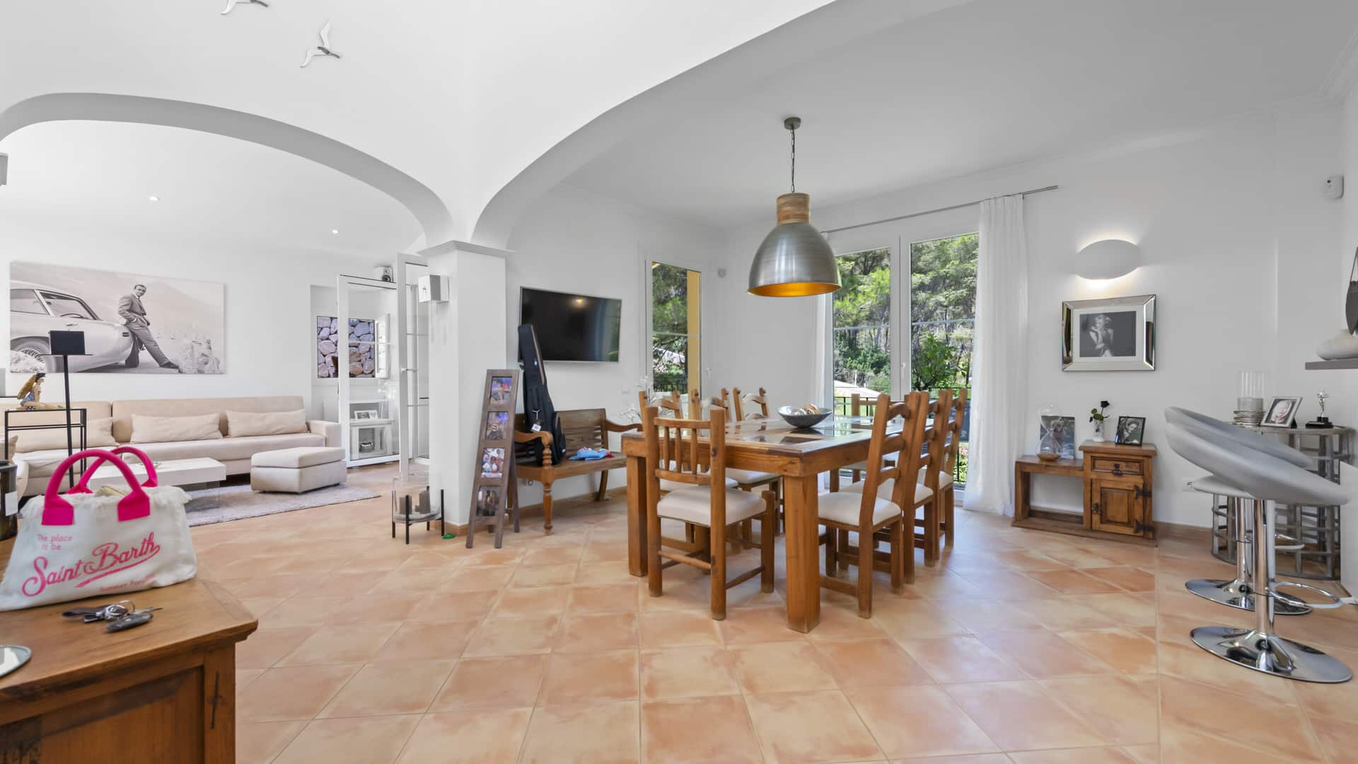 The outdoor area offers several spacious and partly covered terraces with beautiful plants as well as a pergola with barbecue and dining area.