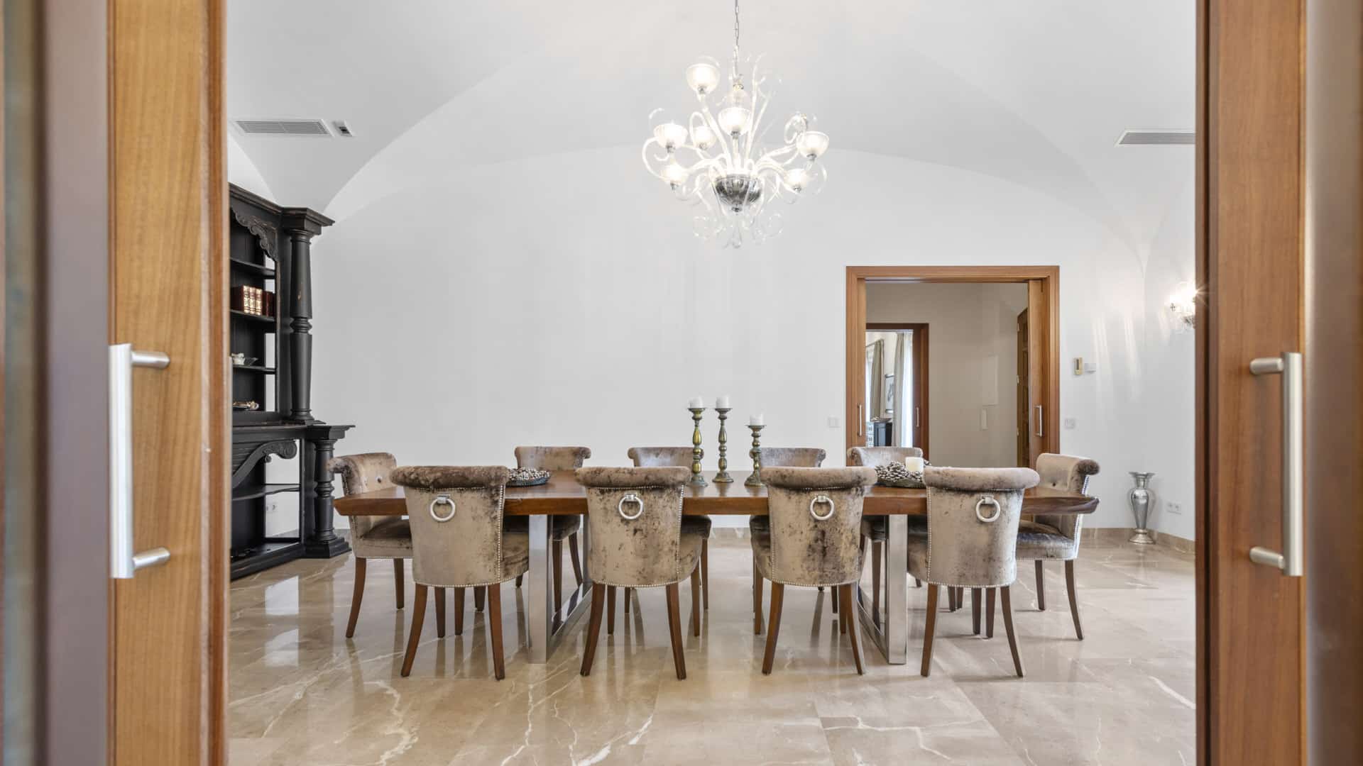 Several entrances in the living area lead to the large terrace with far-reaching views and an extra-large table for celebrations and get-togethers with family and friends.