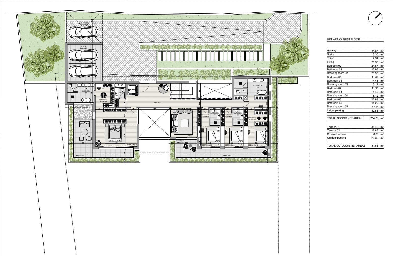 Four spacious bedrooms, each with its own bathroom, await you on the upper floor. The master bedroom also has its own dressing room. An additional living area offers you space for relaxation and privacy. A covered garage for two vehicles provides additional comfort.