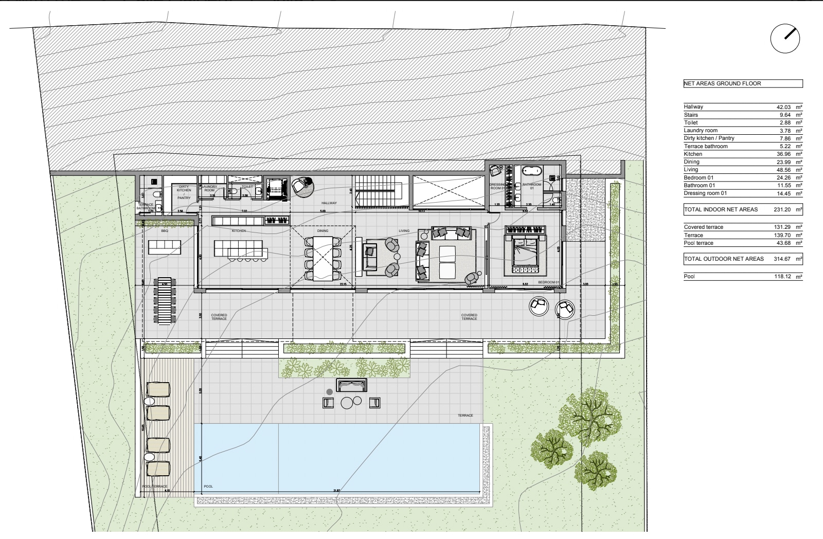 The spacious outdoor area invites you to linger outside. Several partly covered terraces, a spacious swimming pool and a lovingly landscaped Mediterranean garden provide the perfect setting for unforgettable hours with family and friends.