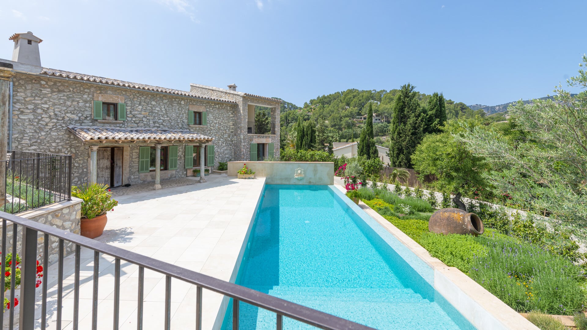 On the upper level there are four further bedrooms, all with en suite bathrooms, balconies and breathtaking views of the mountains. The outdoor area is beautifully designed and offers a large saltwater pool as well as several, partly covered terraces where you can enjoy the peace and quiet.