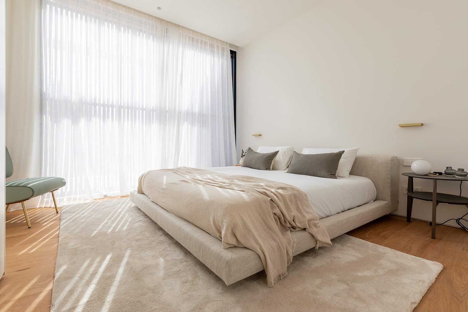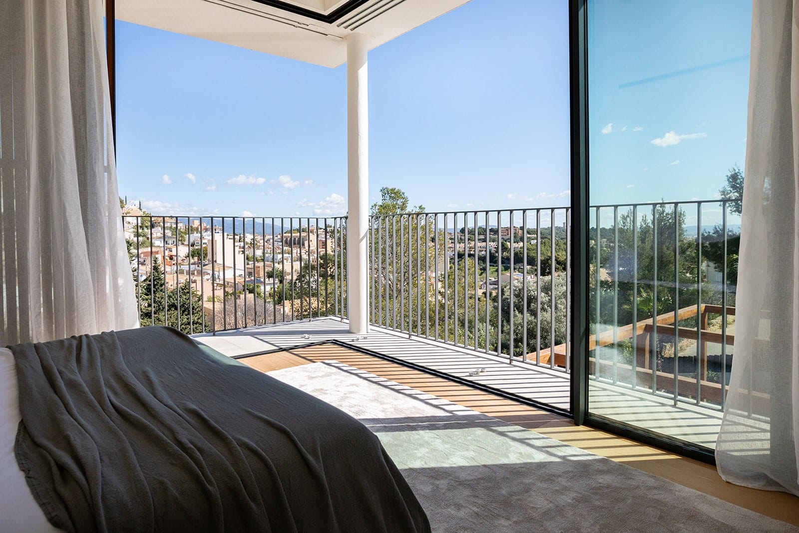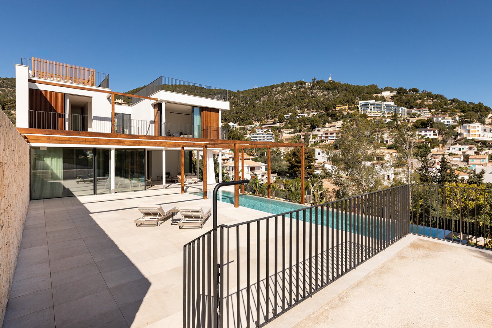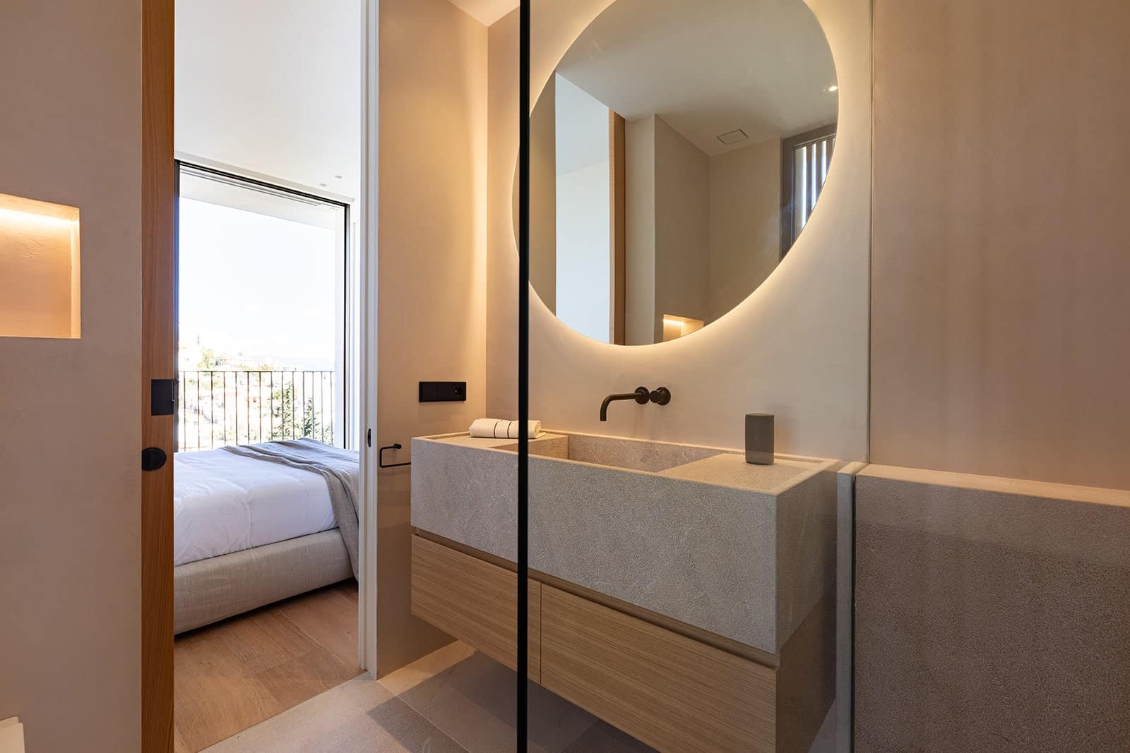 The plant-filled atrium will be the centerpiece of the first floor, filling the space with natural light. The entrance hall, staircase, utility room, double bedroom with en-suite bathroom will also be located on this level. The spacious kitchen, dining and living room will be arranged on two levels. The living area will be glazed to the ceiling on one side and will overlook the dining and seating areas from the terrace, making the most of outdoor living opportunities. On the second floor, which will also be accessible via an external staircase, there will be three further double bedrooms and bathrooms. Two of these will face the atrium, which will provide plenty of light. These will also have access to a shared terrace with views of the countryside. First-class construction, the best materials and high-quality appliances are used in this modern Mallorcan home. The use of light-colored woods throughout, natural stone cladding and lots of glass in the interior and exterior will make this house a real eye-catcher.