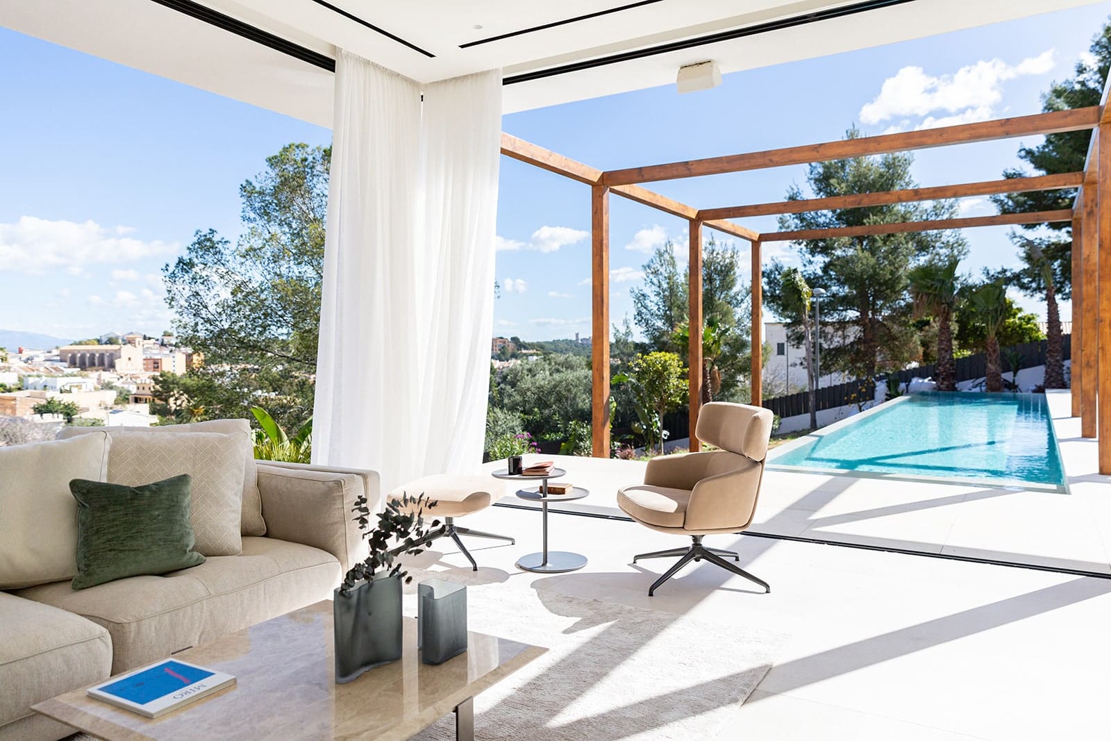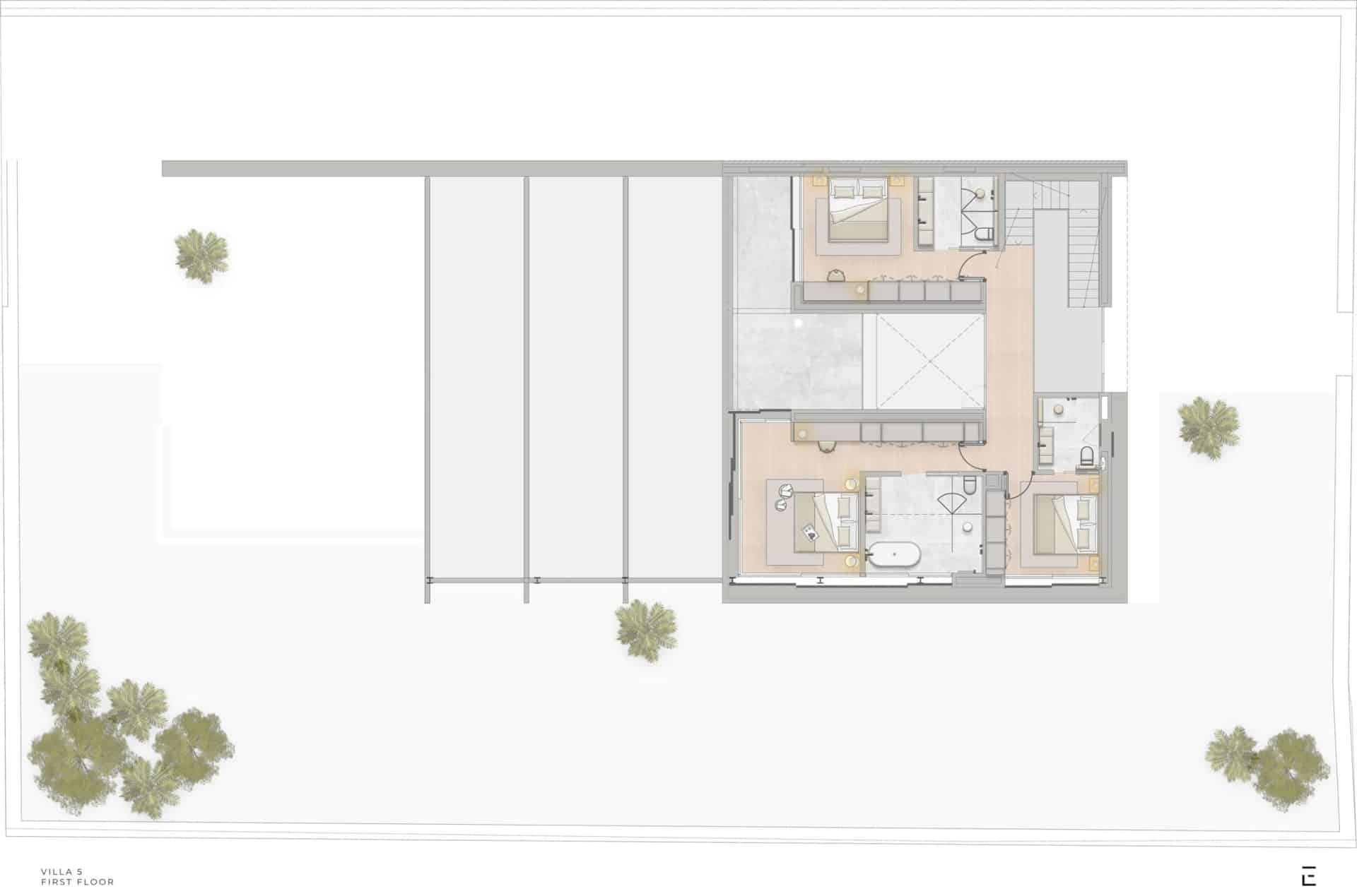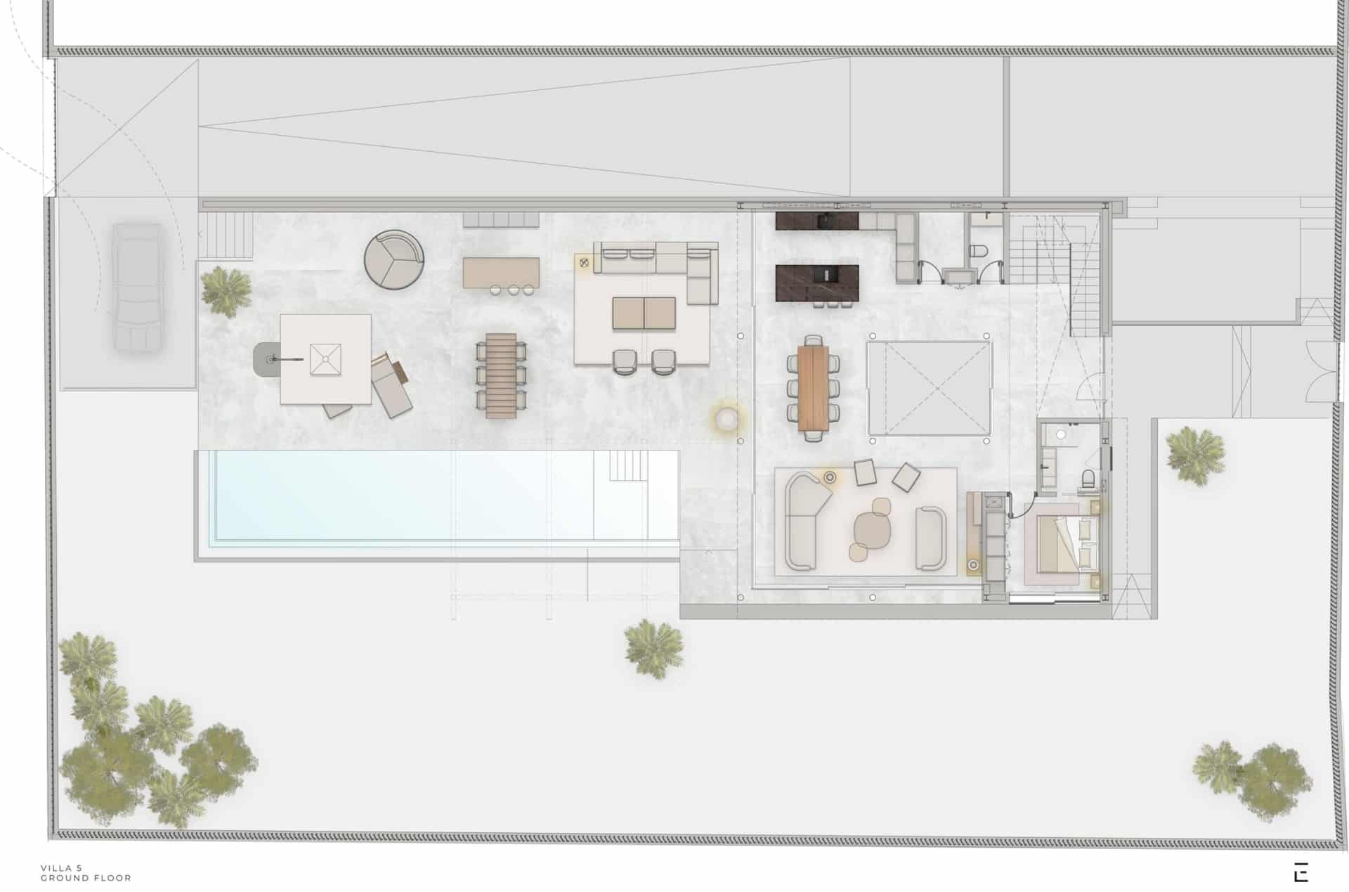 This luxurious villa has a living area of approx. 219 m² and will offer a private pool, spacious terraces, a central atrium that brings natural light into the interior and an underground garage for three vehicles.