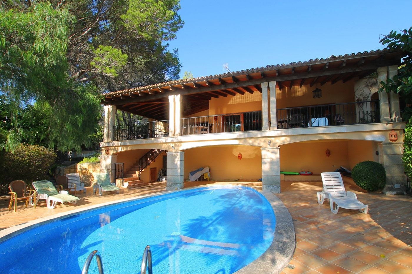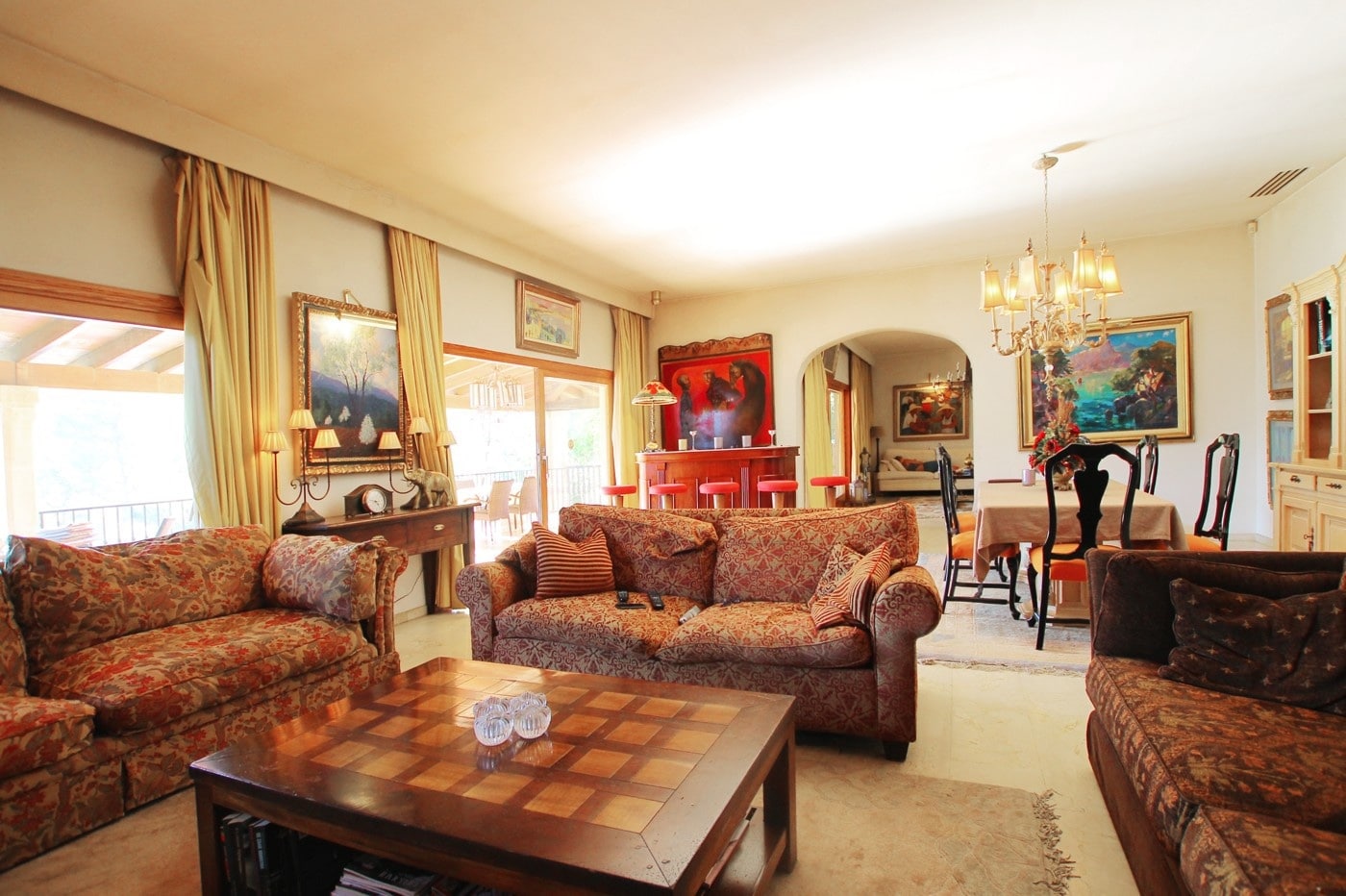 On a 4680 m² south-facing plot in the exclusive area of Son Vida, this beautiful villa enjoys sunshine all day long. With a living area of approx. 483 m², on one level we find the entrance hall, a large living / dining area with open fireplace leading directly onto a covered terrace, a further living room, a fully fitted kitchen, 5 bedrooms and 5 en-suite bathrooms. One level down we find the beautiful pool surrounded by extensive terraces. The villa also offers an independent guest house with 1 bedroom of approx. 60 m².