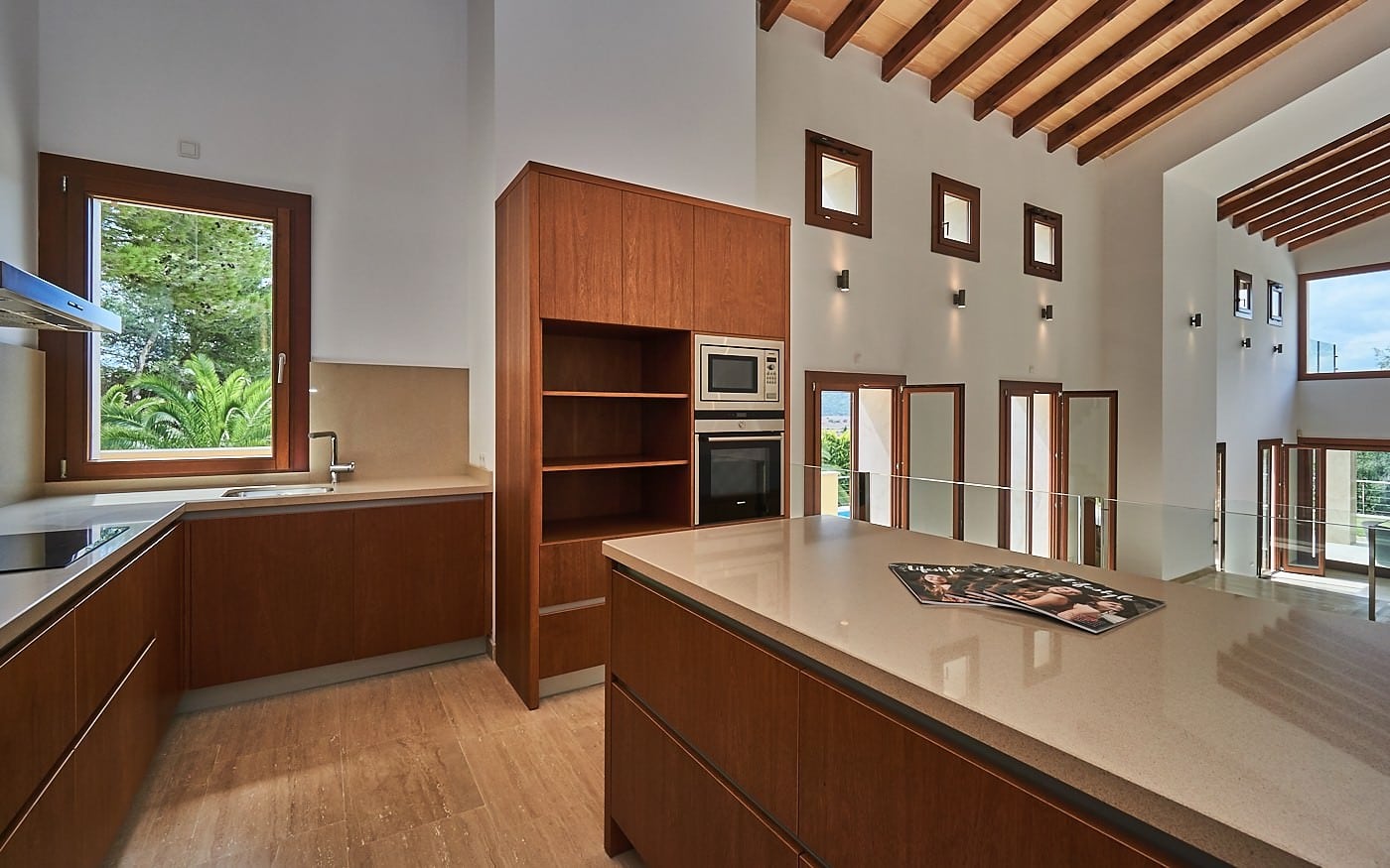 This villa has five bedrooms, each with its own bathroom. The kitchen is fully equipped with Siemens appliances as well as a Liebherr refrigerator with wine cooler. In addition to the dining and living room, this luxurious property also has a studio, a dressing room and a large storage area. Enjoy the garden and pool with its retractable glass roof and wonderful waterfall. The 40 m² pool is perfectly integrated into the garden and surrounded by large teak terraces and verandas. The fully automated luxury villa in Canyamel is finished and equipped to a high standard.