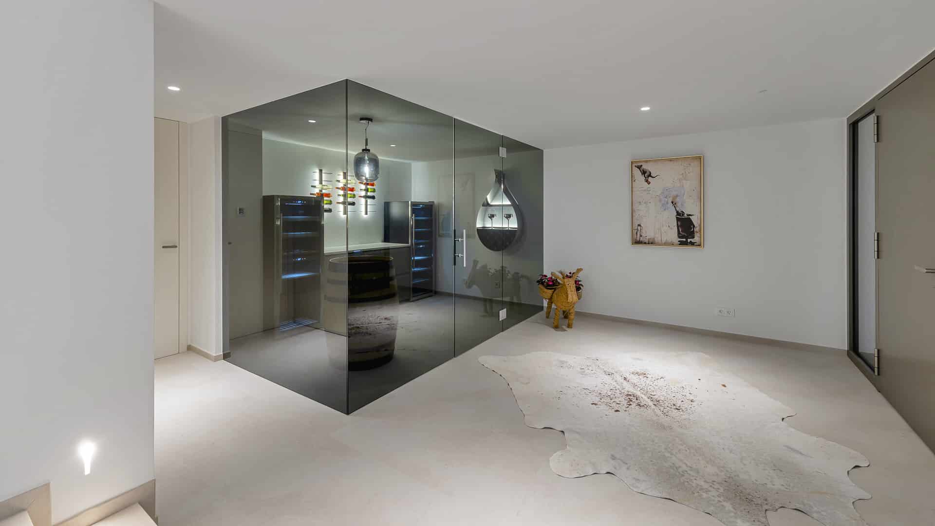 In the basement of the designer villa there is a large garage with space for 4 vehicles, two carports with roofing, the vinoteca, a fully equipped cinema room with sound system, a fitness room with whirlpool and sauna.