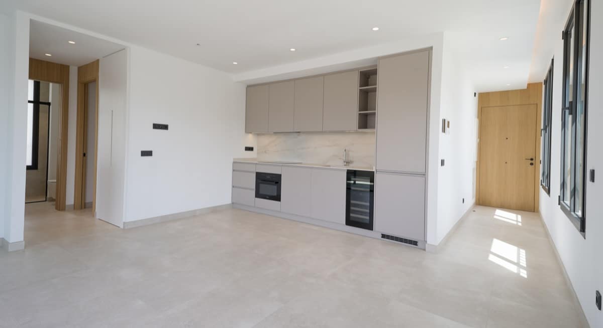 The living area is divided into an elegant living and dining room with access to a covered terrace and an ultra-modern, high-quality equipped kitchen.