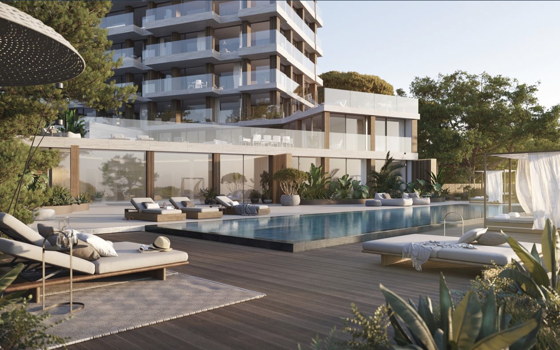 The property is located on the 3rd floor, has a floor space of approximately 263m² and extends as follows: A light-filled and spacious living/dining area with adjoining fully equipped high-end kitchen, two bedrooms with two en-suite bathrooms, a storage room and a laundry room. The master bedroom has an en-suite bathroom with shower and bathtub, a spacious walk-in closet and several built-in closets. From the living/dining/kitchen area you have access to a spacious terrace with fantastic panoramic sea views. A garage for two vehicles is included in this offer. The common area will offer a large garden with elegant pool landscape. The completion of this complex is expected until the end of 2024.