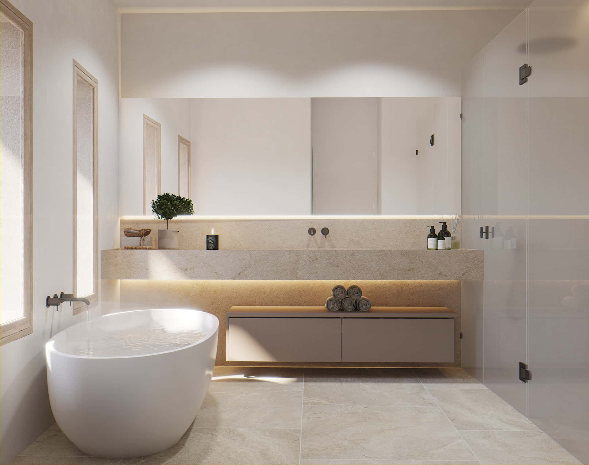 The first and second floors accommodate 2 double bedrooms, each with a dressing area, an en-suite bathroom and a private terrace.