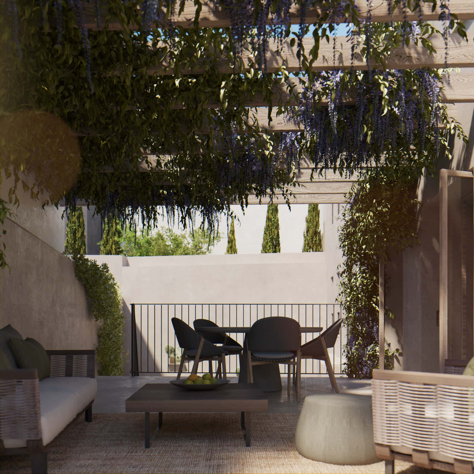 Mediterranean plants and a lemon tree adorn the area. Enjoy the Mediterranean flair!