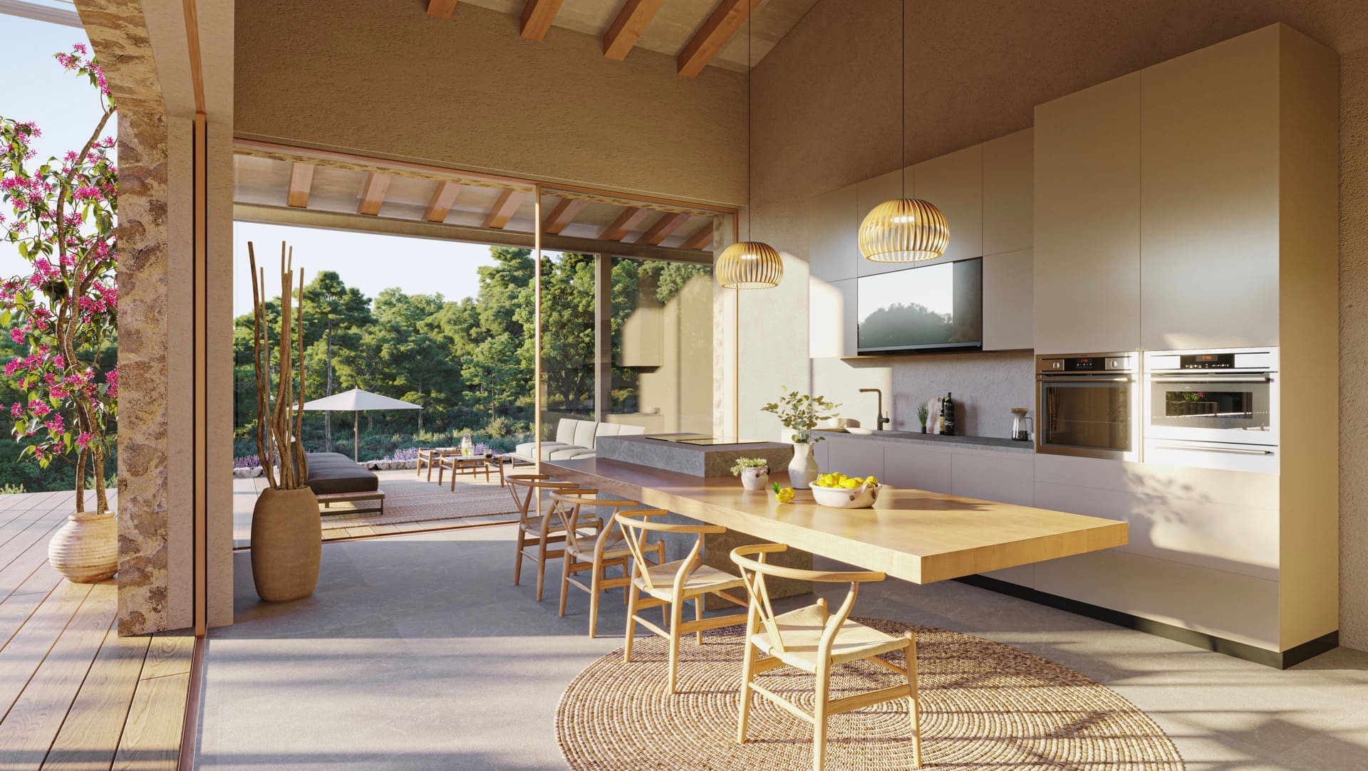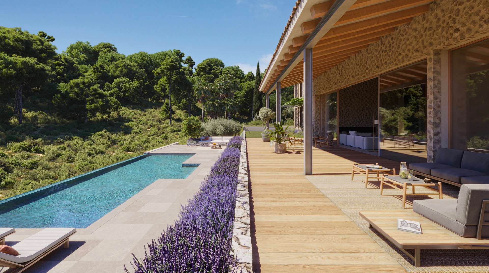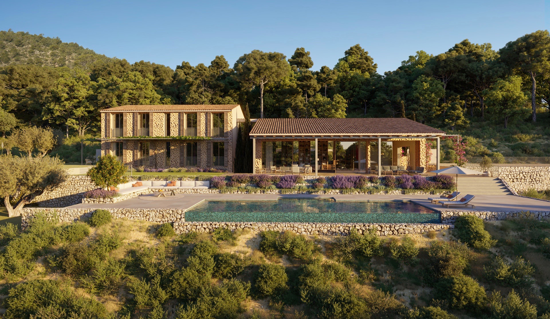This exceptional luxury villa new construction project is located on a hill, which offers breathtaking views in the distance. The plot of approximately 33,280 m² is located in a private area of Santa Maria and is surrounded exclusively by nature, which guarantees absolute privacy.