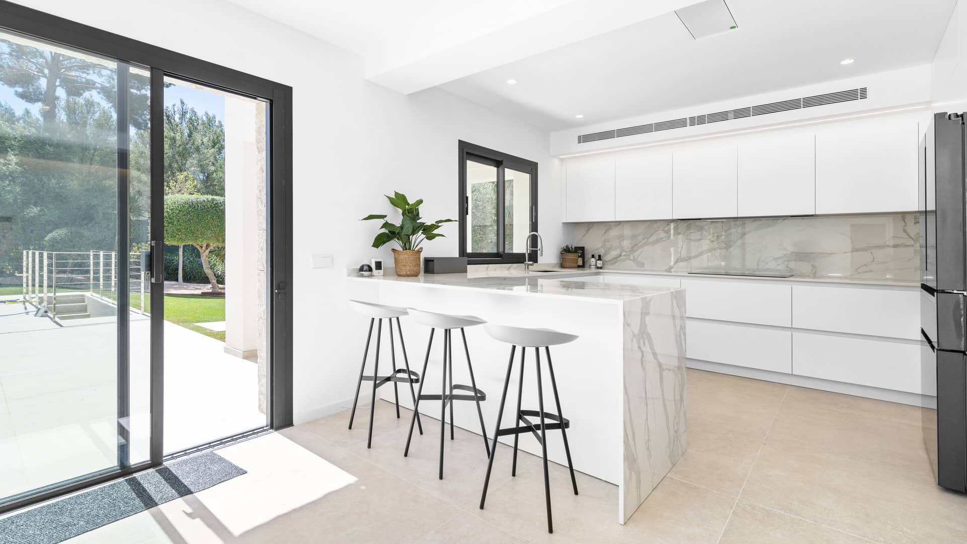 The property has been completely and lovingly renovated using the highest quality materials. This villa is characterized by its unique style and offers spacious, light-flooded rooms. Thanks to its south-facing orientation, the 300 days of sunshine a year can be enjoyed here either in the sun or in the shade. The property is spread over two levels and offers plenty of space and room. On the first floor there is an open, light-flooded living and dining area, an open, modern kitchen, three bedrooms, one of which has an en-suite bathroom, a bathroom, a guest WC and a utility room. There is also a double garage, a carport for 2 vehicles and 4 outdoor parking spaces. The utility room is also located on this level. From the spacious living area you have access to the garden area with saltwater pool and several covered & open terraces for relaxing. On the upper floor is the master suite with dressing area and an en suite bathroom, as well as two further bedrooms with en suite bathrooms and a room that can be used as an office, for example.