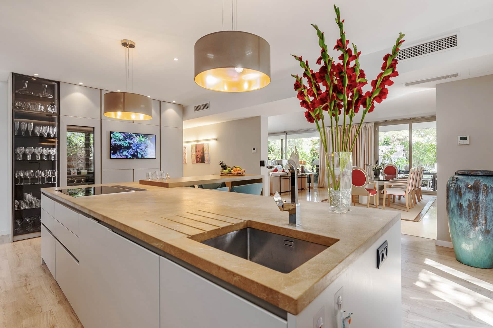 Lage: Sol de Mallorca has established itself as a popular residential area on the Balearic island, which promises a high quality of life due to its proximity to the capital Palma. The center of Palma can be reached by car in 15 minutes. The international airport is only 25 minutes away. A positive aspect of this Mallorcan residential area is that Sol de Mallorca - despite its proximity to the airport - is not an air corridor. Locals enjoy a quiet and luxurious life as there are no disturbing factors such as industry or thoroughfares. The panoramic view of impressive rock formations or small dreamy bays from properties like this designer villa is impressive. Furthermore, this gorgeous location is known for its natural pine groves or the idyllic "three finger bay" called "Portals Vells".