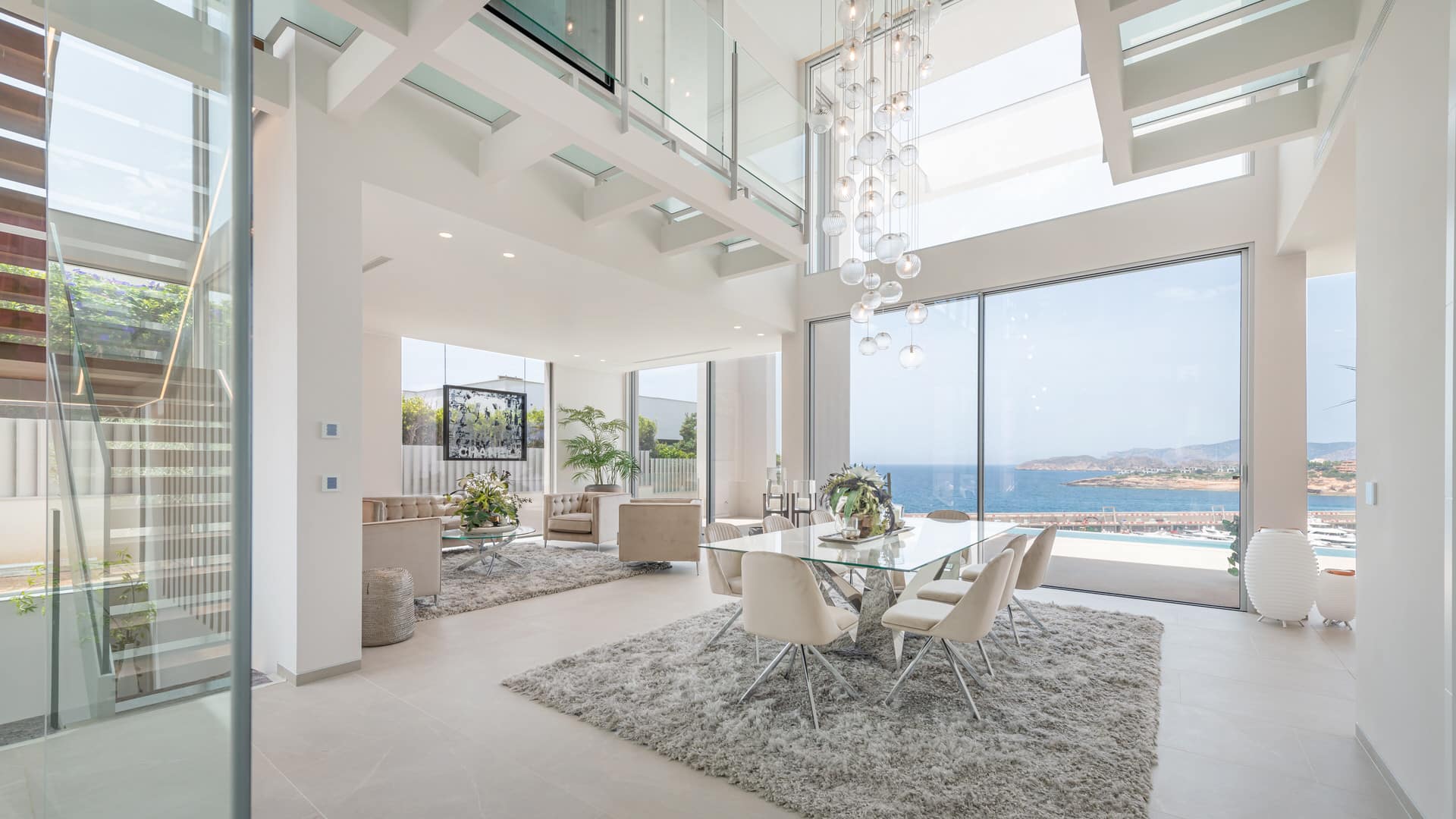 The spectacular sea view villa extends over a total of 615 m² and impresses with its innovative room layout. On the first floor, the entrance area, there is a glass designer elevator that elegantly connects all three levels of the property.