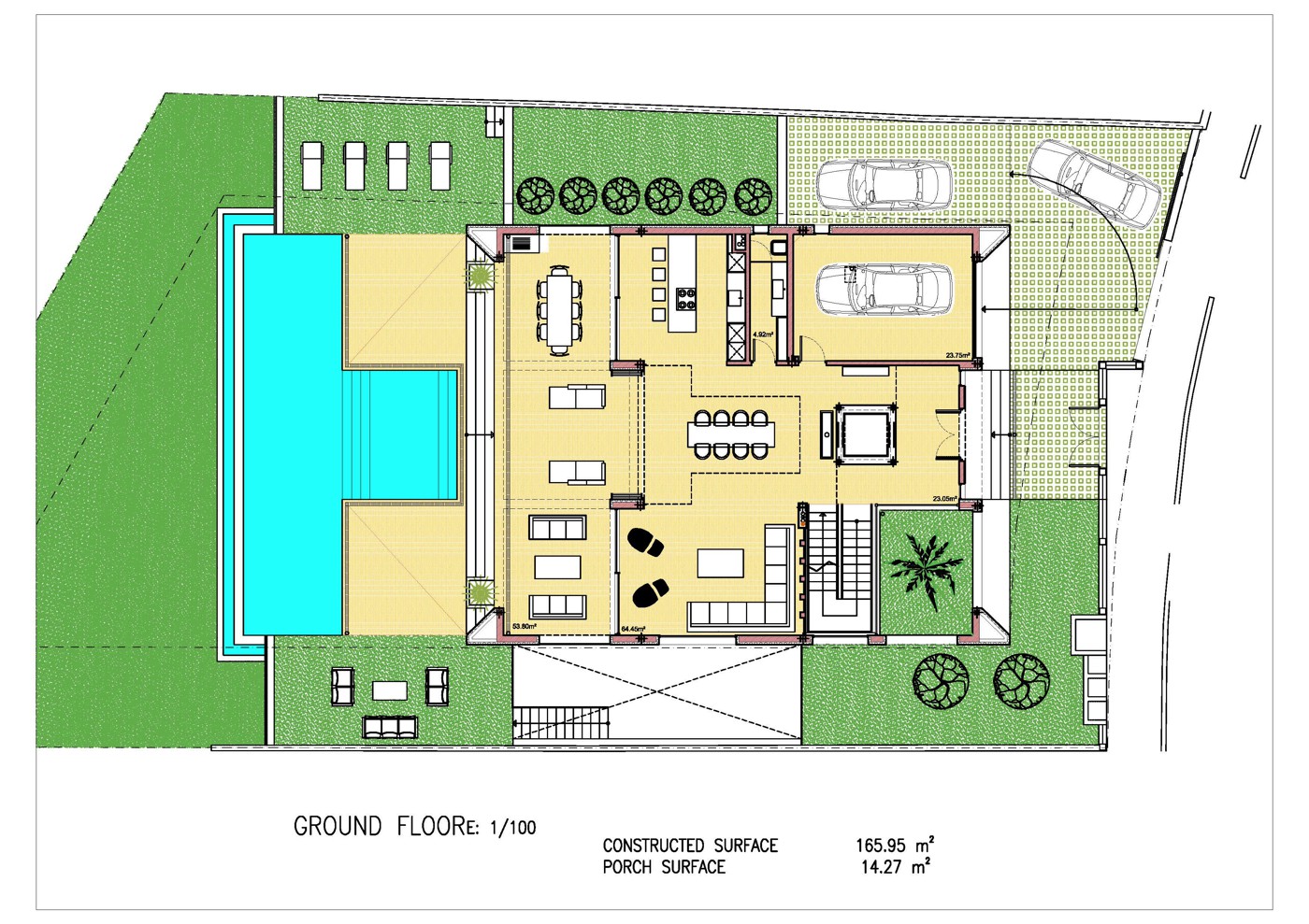 On this level, you will find a spacious living and dining area with double-height ceilings, which flows seamlessly onto the 100 m² terrace with infinity pool. The open, fully equipped kitchen, a double garage and a guest WC complete the offer of this luxury area.