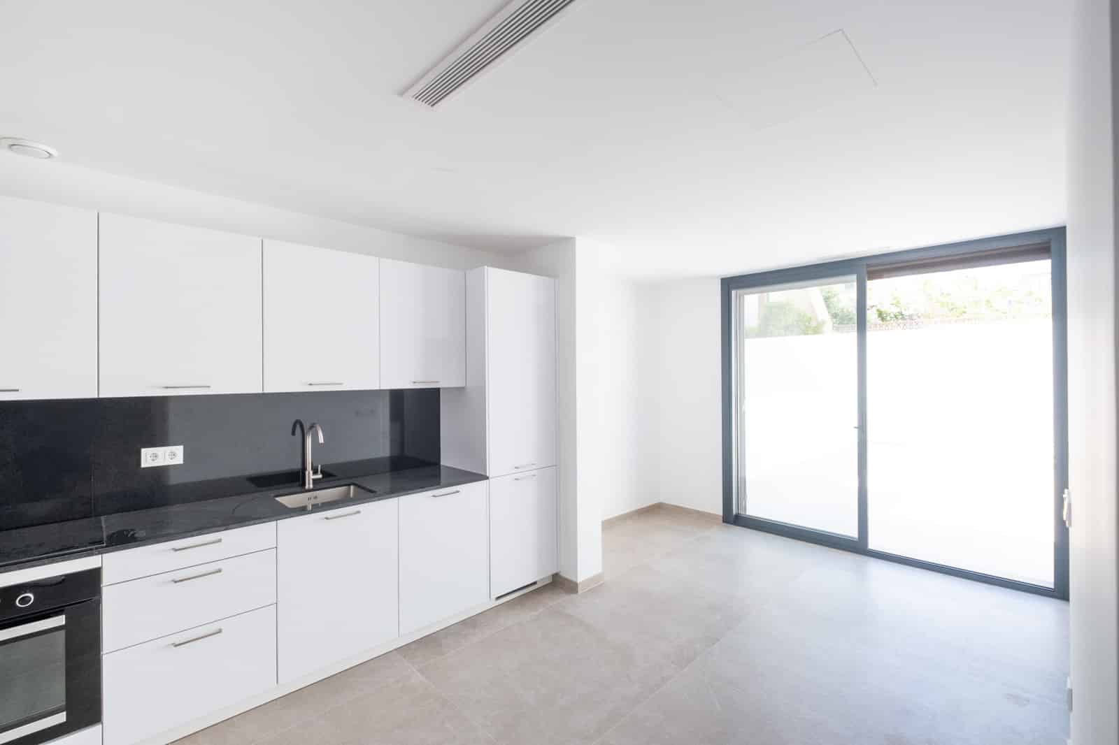 The floor-to-ceiling aluminum window and door elements with Mallorcan shutters provide plenty of natural light and harmoniously connect the interior and exterior.