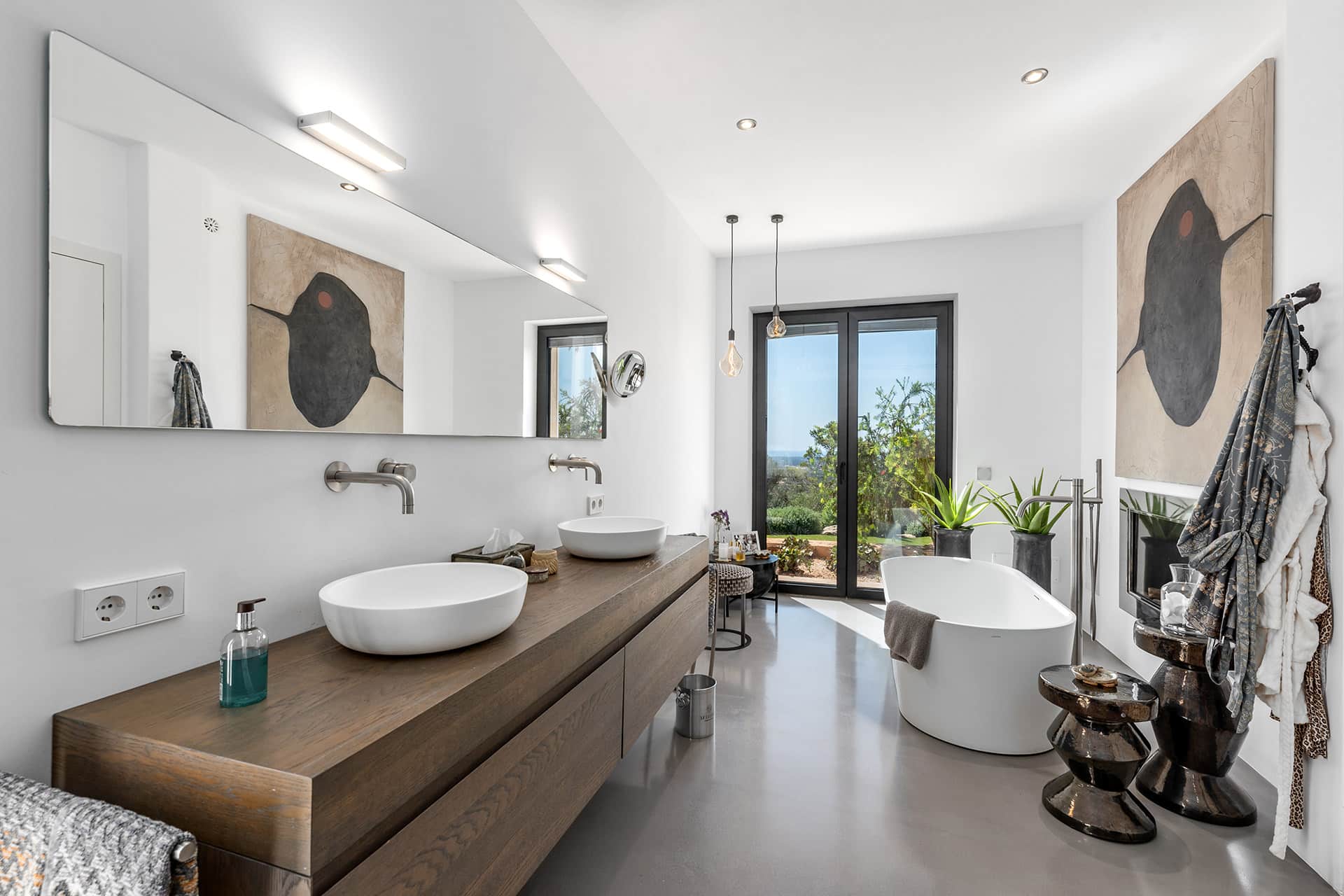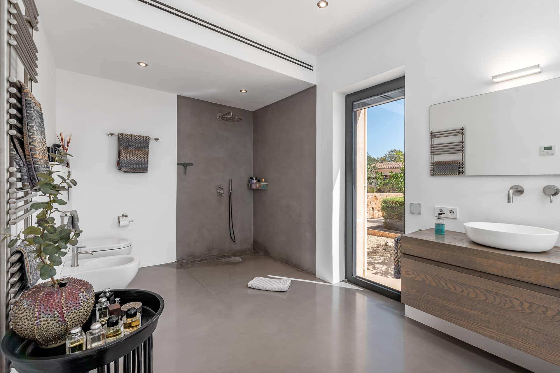 The finca offers plenty of space and has five well-appointed bedrooms. The spacious master suite boasts a private dressing room, a separate TV room and an en-suite bathroom with a luxurious bathtub. Three further bedrooms with two shared bathrooms are located in the west wing, while the fifth bedroom on the upper floor has its own entrance and bathroom.