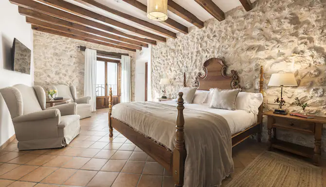 Las diez habitaciones y suites del Fincahotel de Mallorca están amuebladas al estilo tradicional mallorquín y disponen de todas las comodidades modernas, como aire acondicionado (frío/calor), Wi-Fi y minibar gratuito. Algunas de las suites también disponen de bañera de hidromasaje.