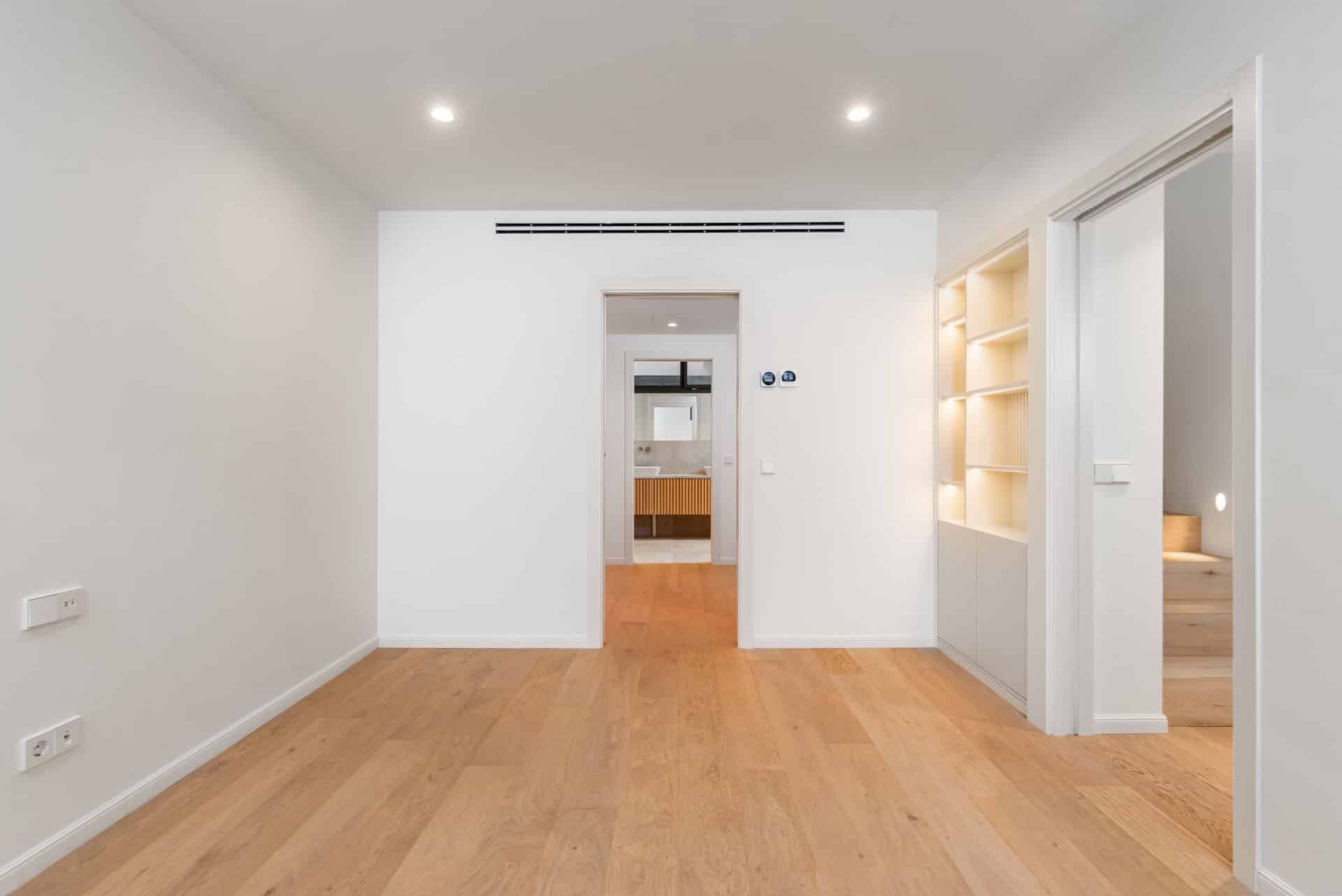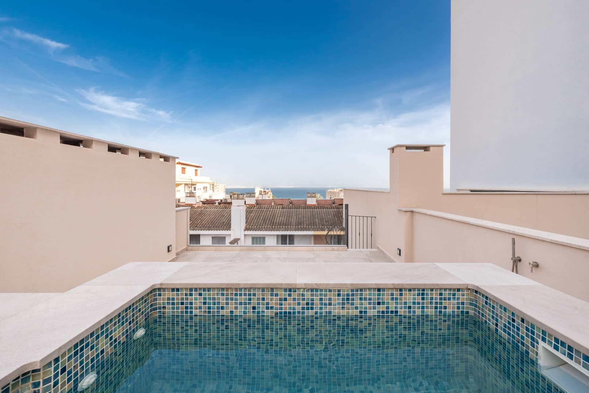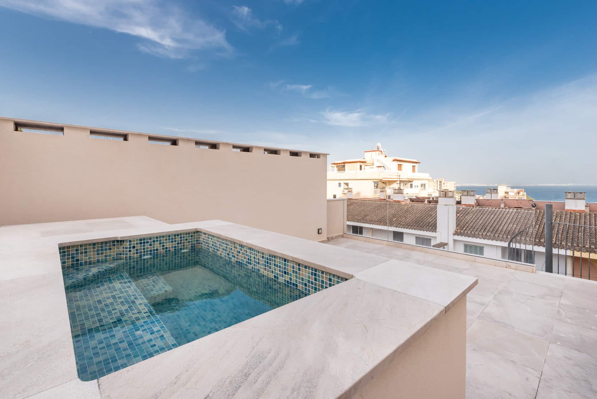 Las viviendas se distribuyen en tres plantas y cuentan con amplias zonas de terraza, incluida una terraza de estilo mediterráneo, un salón en la azotea con jacuzzi y vistas incomparables a la bahía de Palma. Este oasis proporciona un ambiente tranquilo y relajante en el centro de la ciudad. El diseño combina la arquitectura moderna con el encanto típico mediterráneo, dando al proyecto un toque elegante.