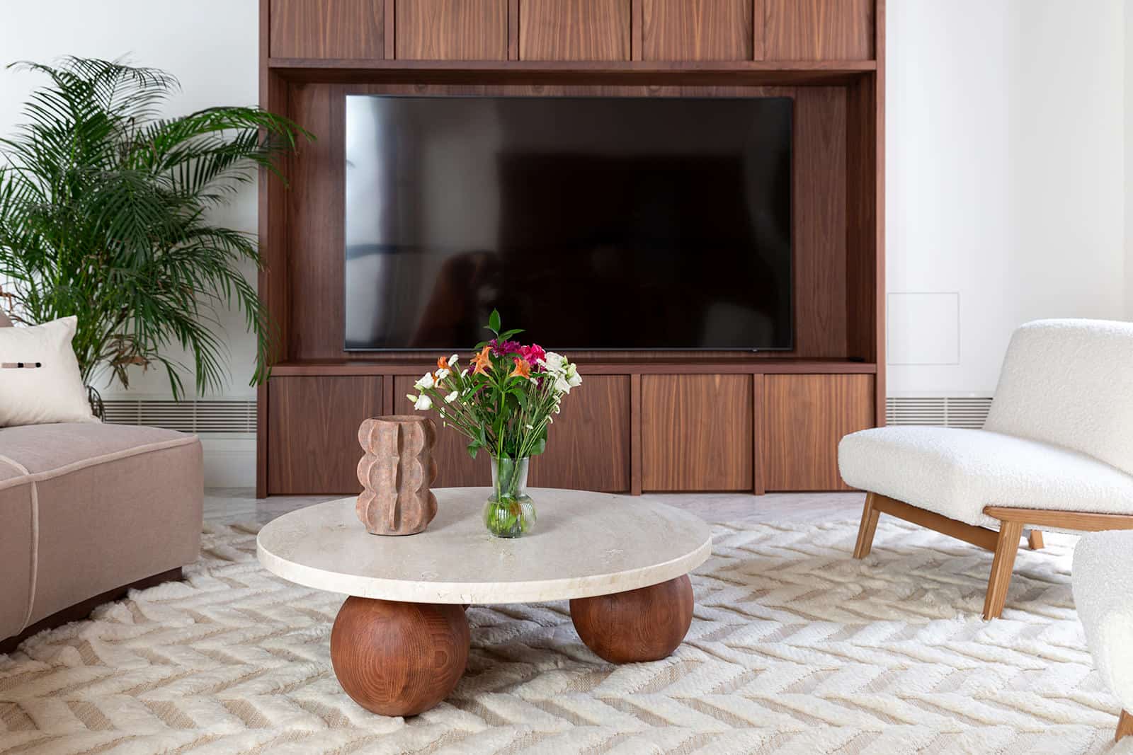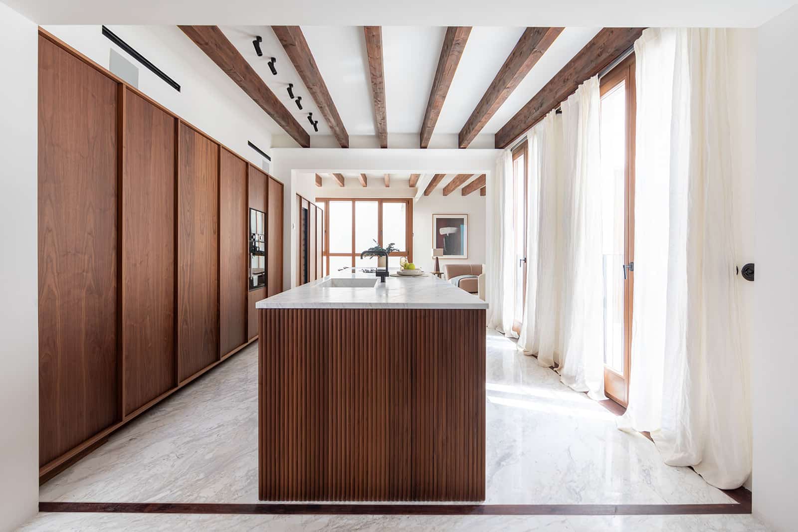En la planta baja, un amplio y luminoso salón con baldosas antiguas y vigas de madera a la vista se encuentra en la parte delantera del edificio, con dos balcones que dan a la calle. En la parte trasera hay dos amplios dormitorios con baño privado. El dormitorio principal tiene ventanas al patio central, armarios empotrados y suelos de baldosas mallorquinas, mientras que el segundo dormitorio tiene puertas acristaladas que permiten la entrada de luz del patio. Ambos cuartos de baño están lujosamente acabados en mármol Volakas y madera de nogal y cuentan con duchas y lavabos dobles con lavabos de mármol integrados.