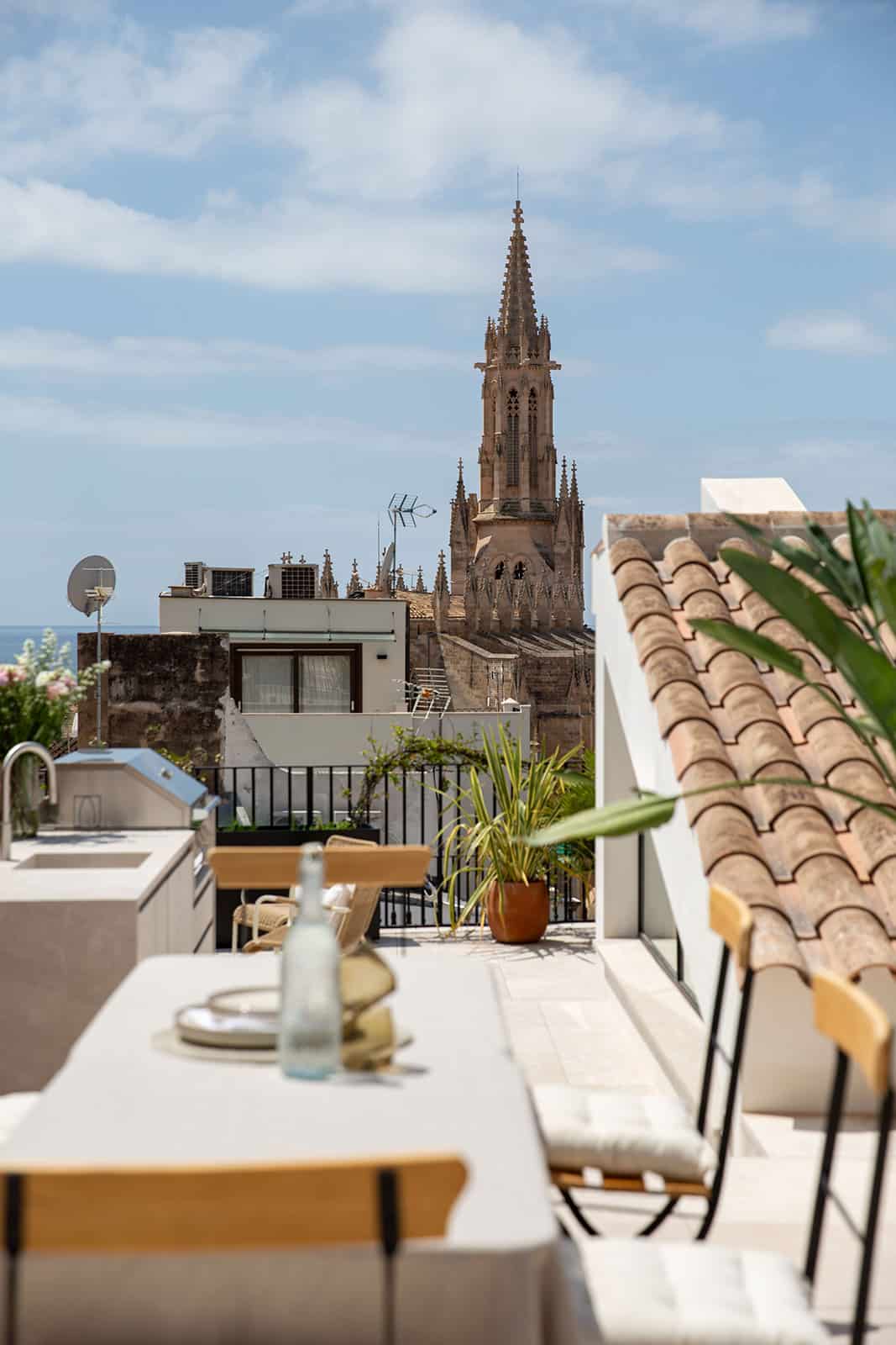 Desde aquí, unas escaleras conducen a una soleada terraza de 76 m2 con amplias vistas a la iglesia de Santa Eulalia, la Catedral y el Castillo de Bellver. Distribuida en varios niveles, es un lugar privilegiado para tomar el sol en los días de invierno y disfrutar de las cálidas noches de verano por encima del bullicio de la ciudad.