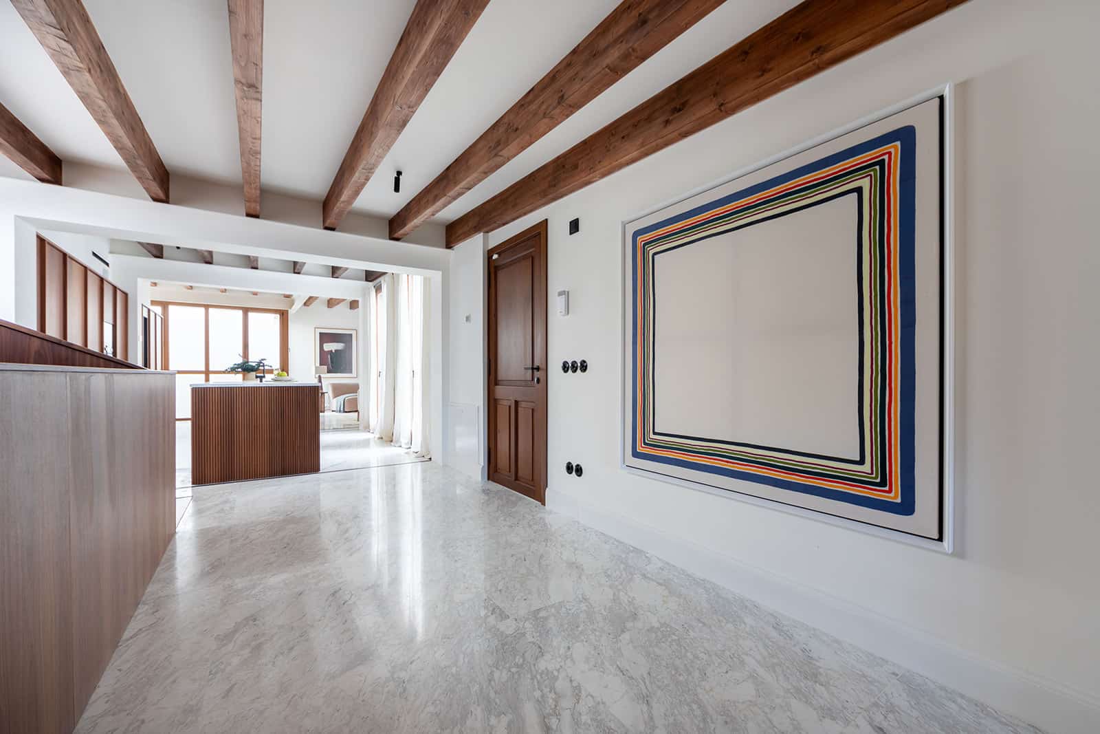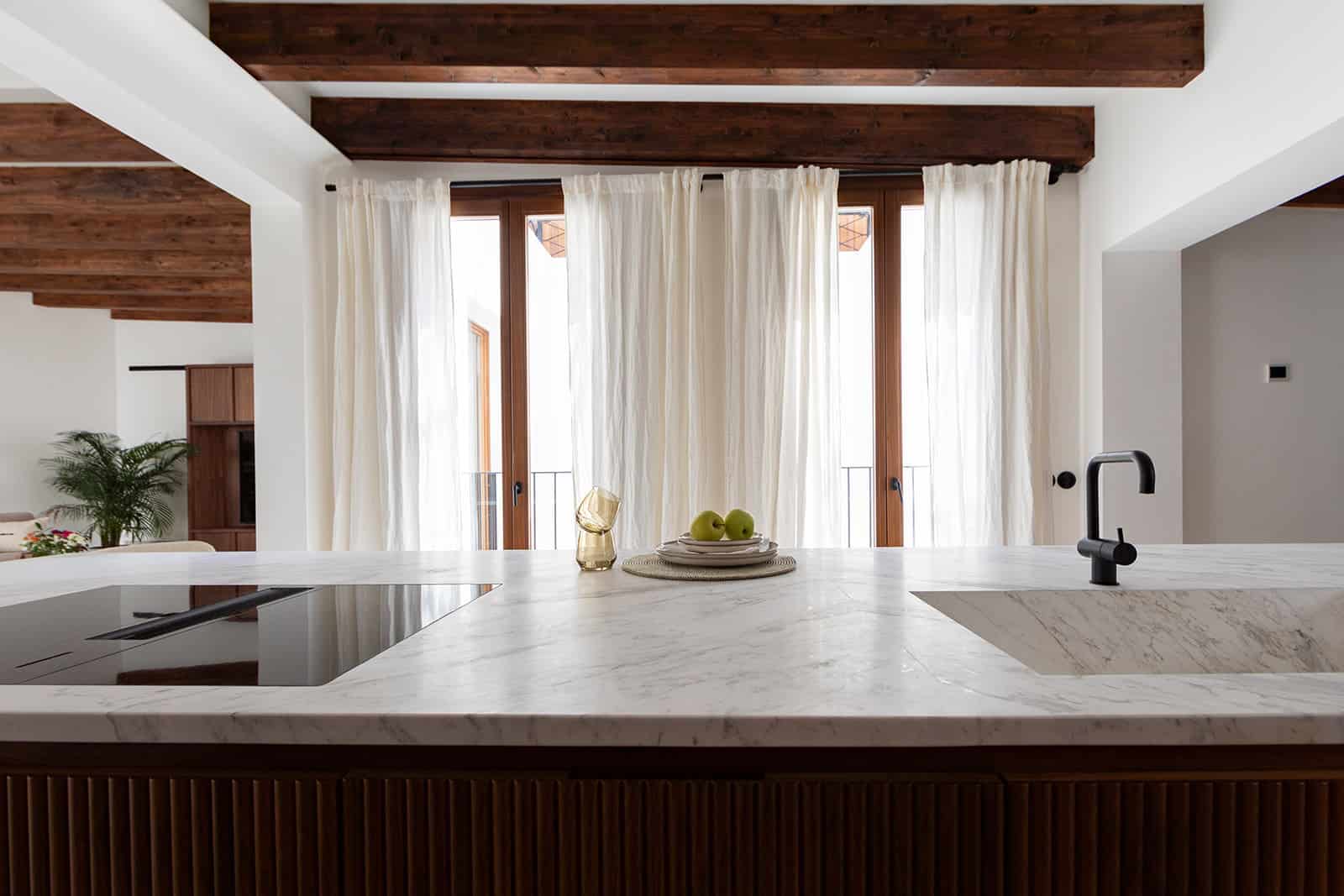 La elegante cocina, acabada en madera de nogal con una isla con encimera de mármol y fregadero integrado, está equipada con electrodomésticos Gaggenau de primera calidad, incluida una nevera para vinos. También en este nivel hay un gran tercer dormitorio con techo inclinado, un cuarto de ducha en suite y un trastero. Los suelos de mármol Volakas con molduras de madera y las vigas de madera a la vista se extienden por todo este nivel, confiriéndole un atractivo elegante y atemporal.