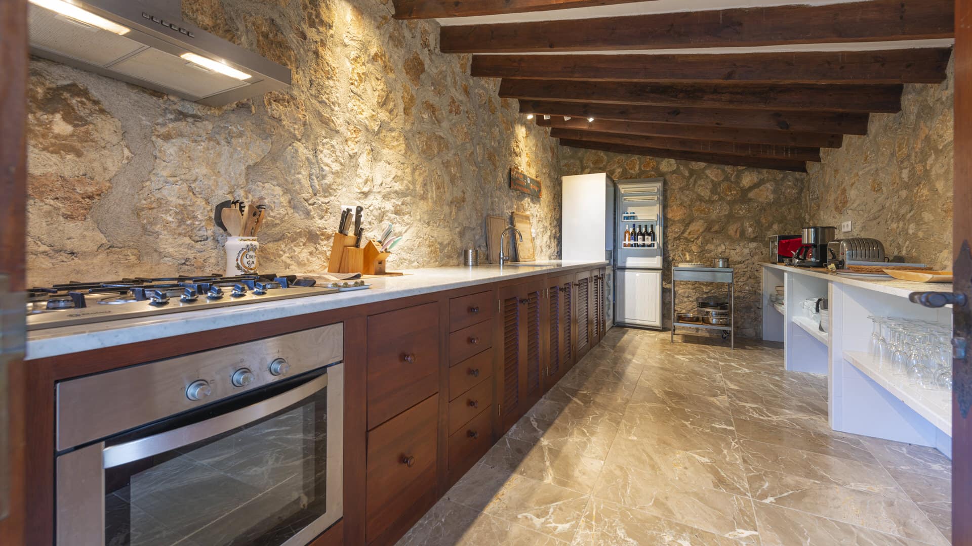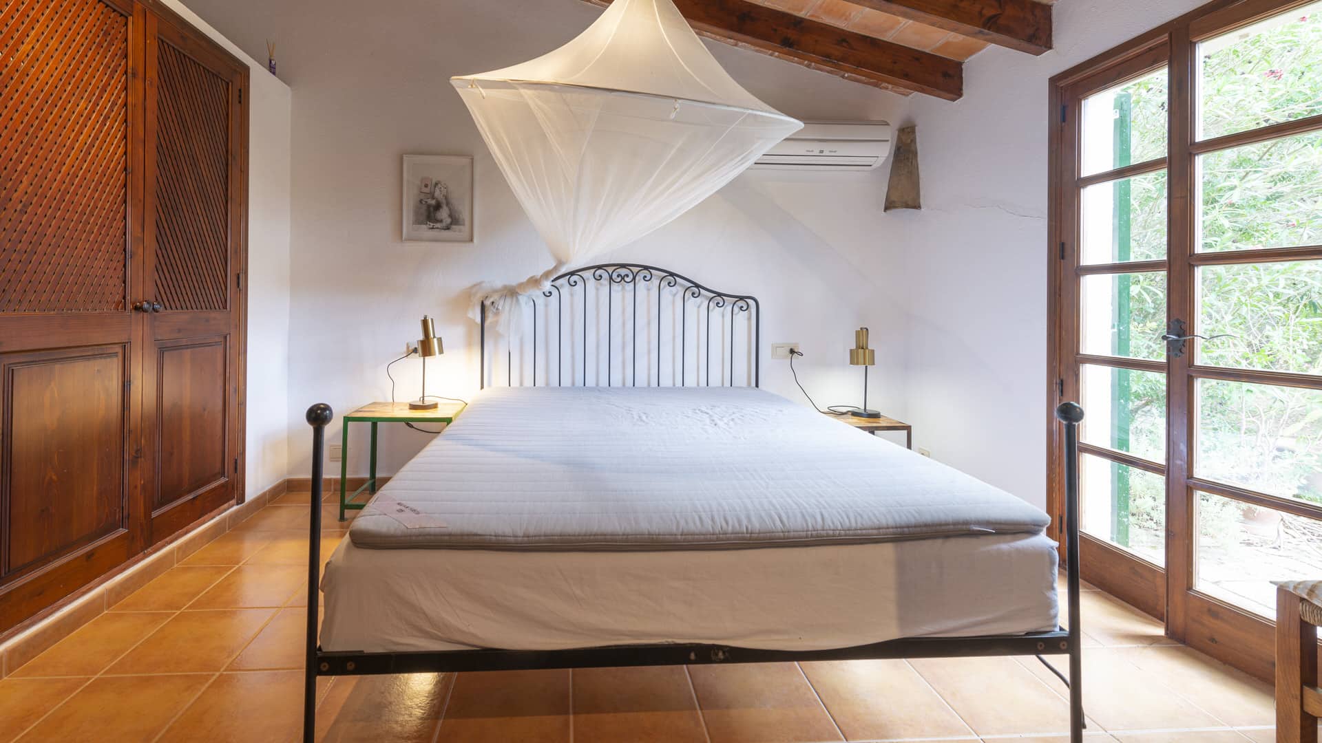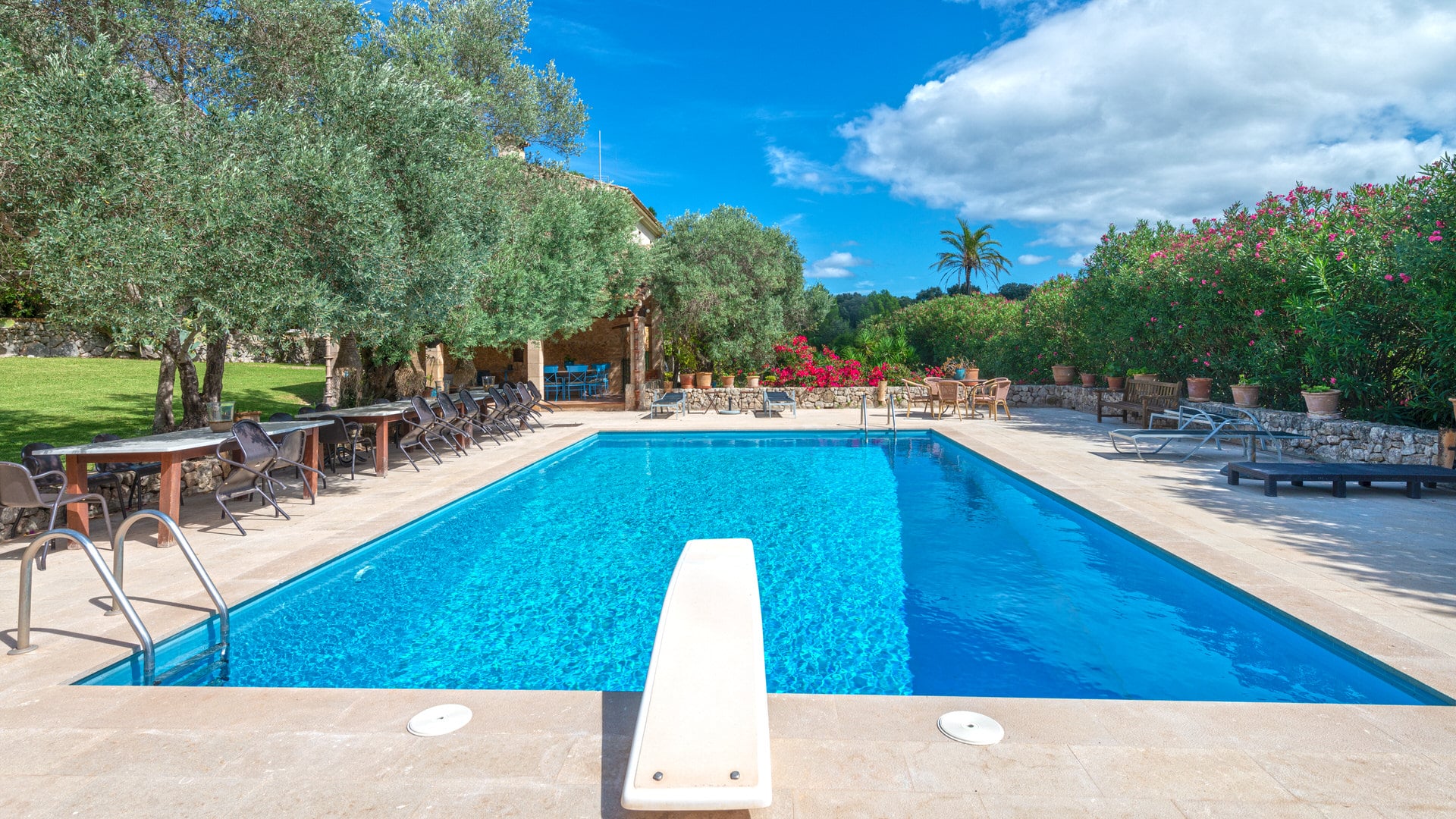 Esta propiedad ofrece tres casas de huéspedes y alojamiento para 24 personas. El edificio principal es típicamente mallorquín, muy confortable. Dispone de un acogedor salón-comedor con chimenea, una amplia cocina totalmente equipada, un lavadero, una sala de televisión, otra sala de estar y cuatro dormitorios, incluyendo la suite principal con su propia sala de televisión y chimenea. Además, hay dos dormitorios individuales y un total de cuatro baños. A cada lado del edificio hay varias terrazas, algunas de ellas cubiertas, con cómodos asientos. Desde aquí tiene acceso directo a la enorme terraza de la piscina, que ofrece mucho espacio para tomar el sol y relajarse, así como una cocina de verano con una zona de asientos cubierta. La primera casa de invitados tiene tres dormitorios y dos baños, un salón/comedor independiente con chimenea y una pequeña cocina, así como su propia terraza y piscina. La segunda casa de invitados tiene dos dormitorios y un baño, un gran salón/comedor de planta abierta con cocina. La tercera casa de invitados ofrece un gran dormitorio (con espacio para hasta 4 personas), un baño y su propia terraza. También hay una pista de tenis iluminada en la propiedad que permite jugar las 24 horas del día.