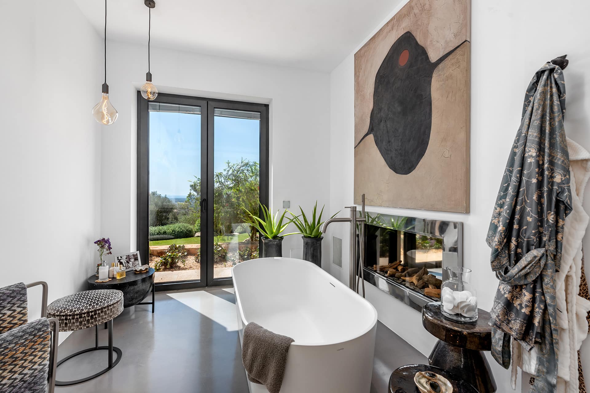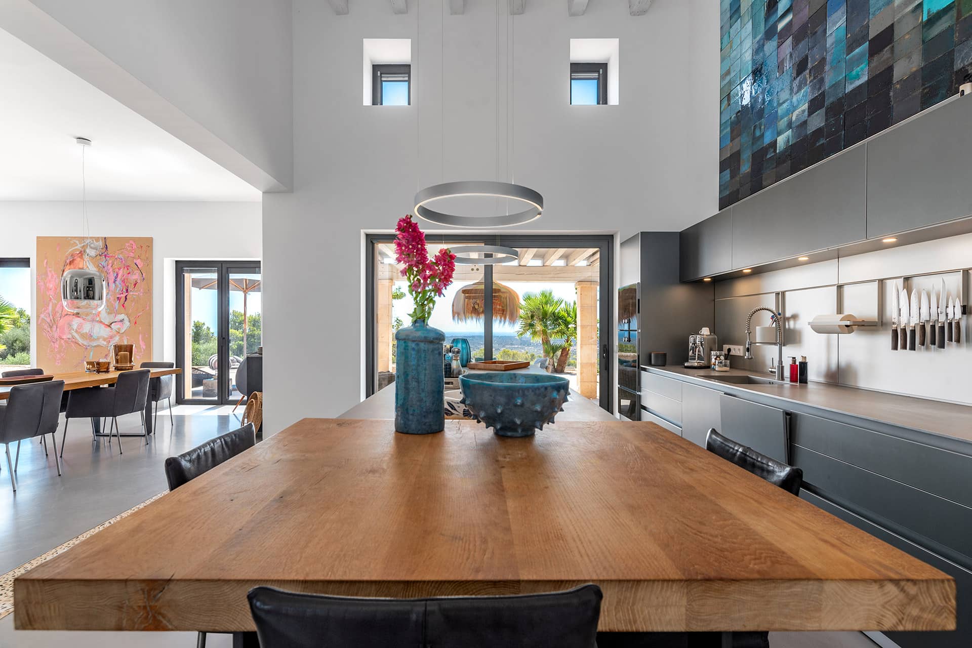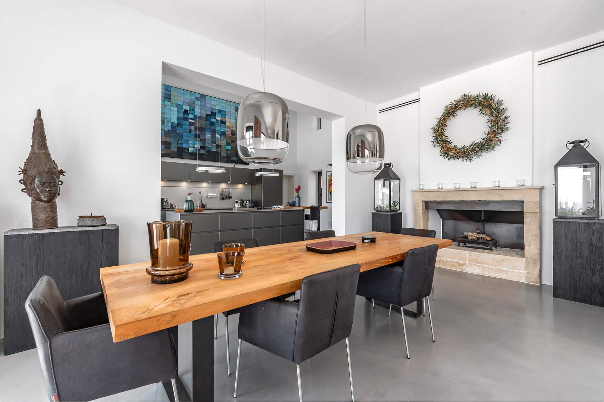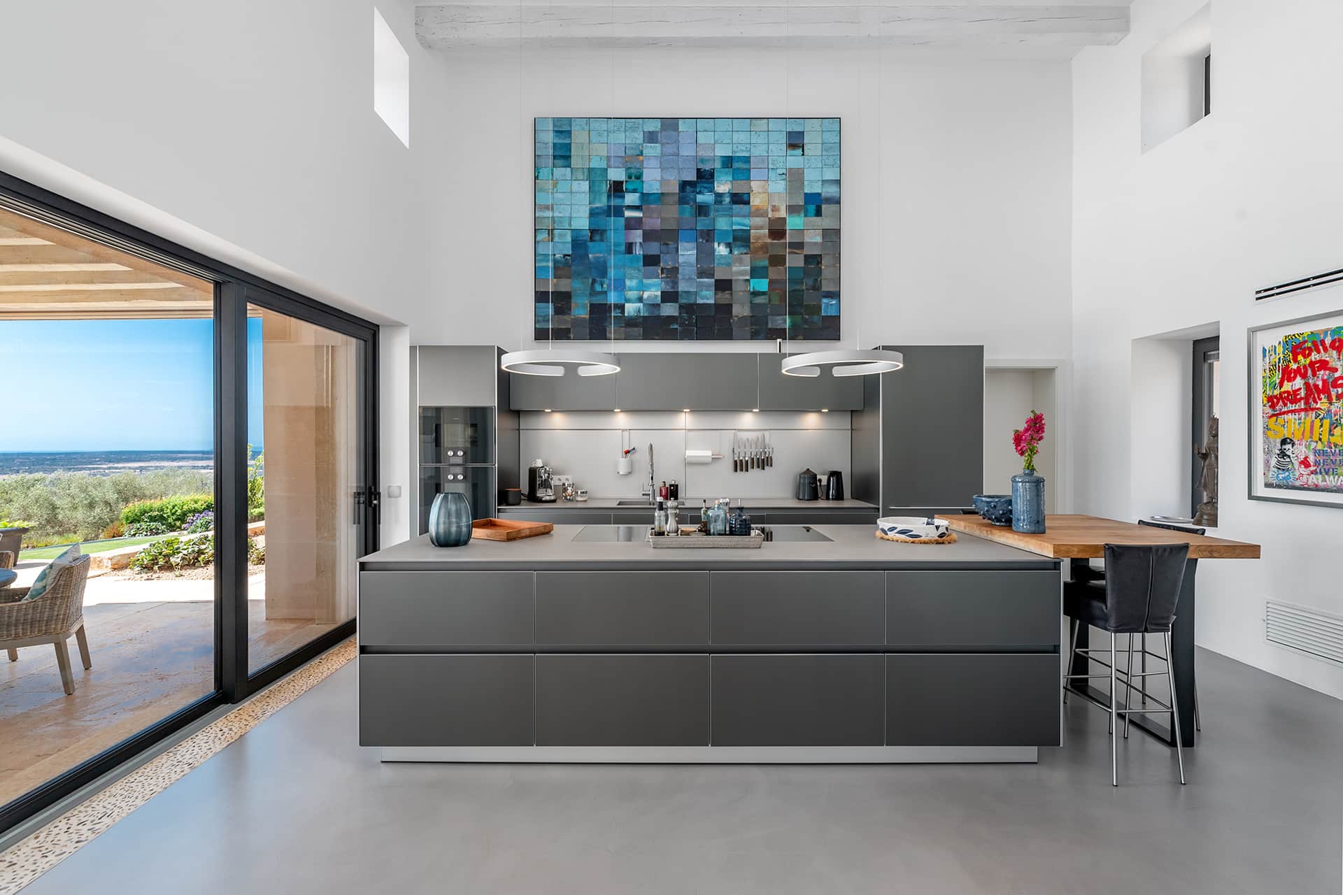 Una armoniosa mezcla de calidad, diseño moderno y encanto rústico de finca, esta residencia personifica la esencia de la vida mallorquina. La distribución única de esta finca en Santanyí y los ventanales de suelo a techo permiten disfrutar de las espectaculares vistas desde casi todas las habitaciones. El amplio salón integra a la perfección un comedor soleado, una cocina Bulthaup abierta y una acogedora chimenea.