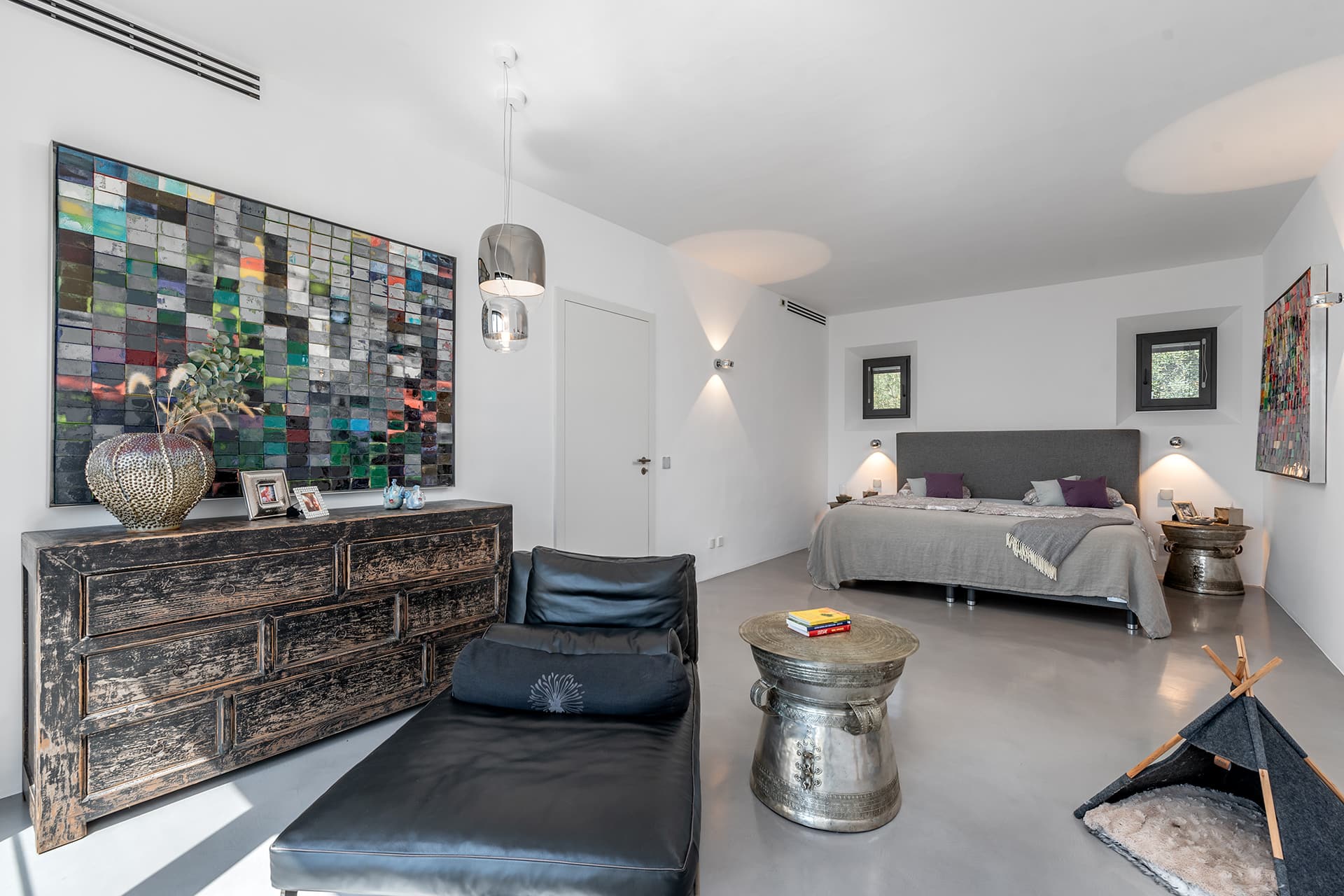 Desde cualquiera de los dormitorios, los huéspedes pueden salir sin esfuerzo a la amplia terraza principal de la finca Santanyí, que sirve de puerta de entrada a los jardines meticulosamente cuidados y a la resplandeciente piscina infinita de 15 x 4 metros. La propiedad ofrece una gran variedad de servicios, como una zona de spa con sauna, un estudio de artista, una bodega hecha a medida con aire acondicionado central y calefacción por suelo radiante. Un aparcamiento subterráneo con tres plazas y una serie de otras mejoras técnicas y de diseño subrayan aún más el excepcional estatus de esta propiedad.