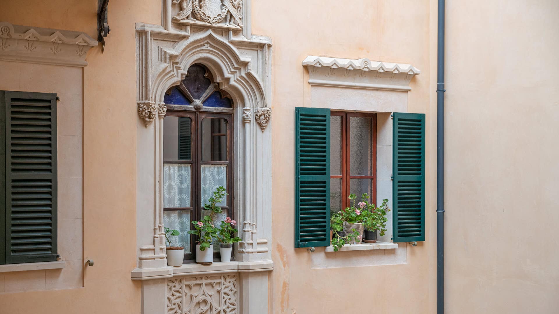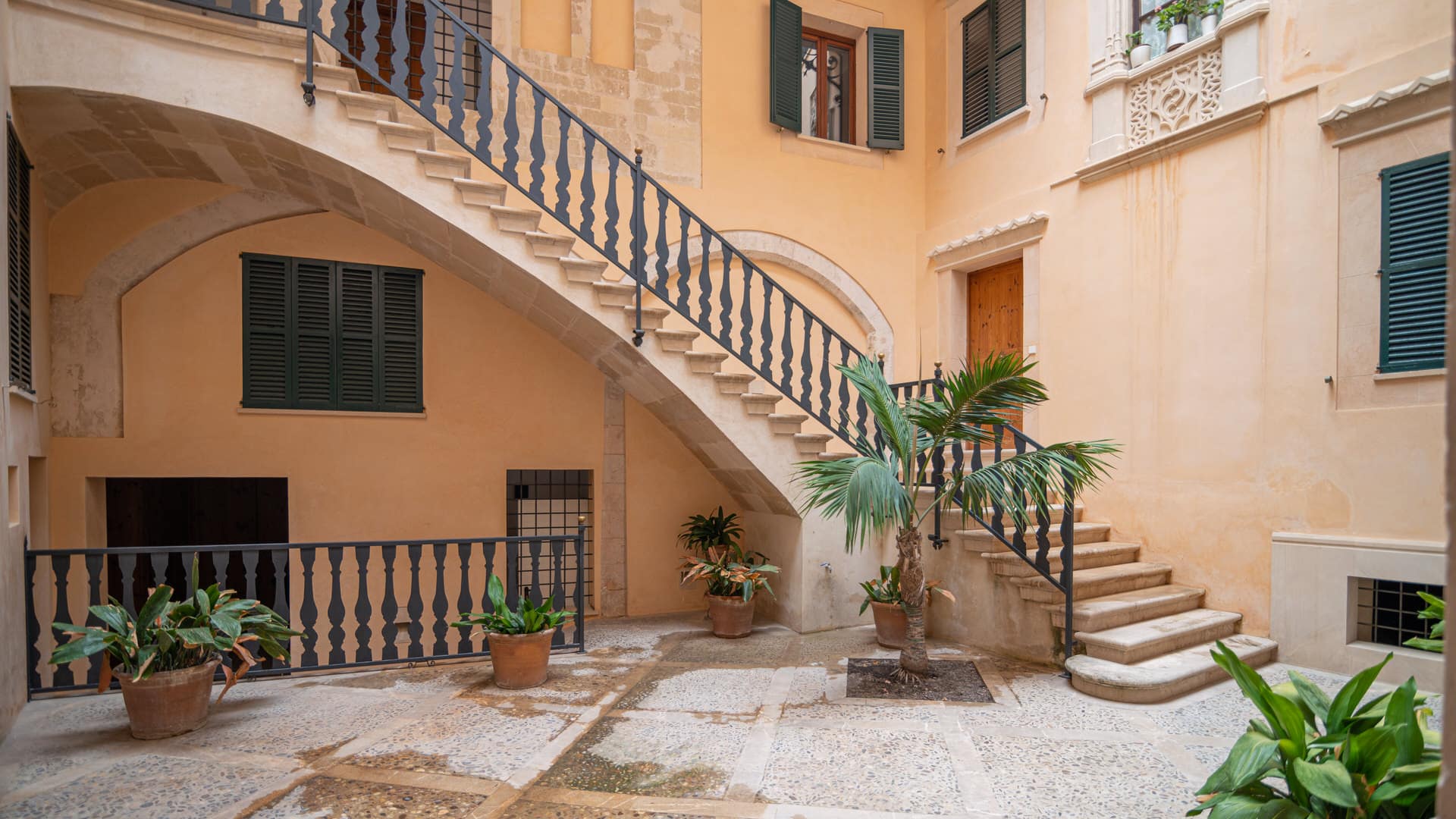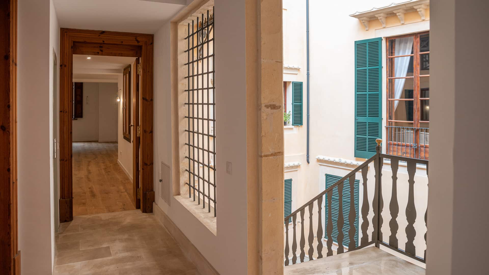 En un edificio histórico del casco antiguo de Palma de 1880, se han creado 8 condominios modernos y un ático. La renovación de la propiedad se llevó a cabo bajo los más altos estándares de calidad y la más moderna tecnología. Un salón-comedor particularmente grande y hermoso recibe a los futuros propietarios tan pronto como entran en el apartamento del edificio antiguo de 213 m². La cocina adyacente es moderna y está completamente equipada. Un punto culminante es un área de vivienda adicional con chimenea y vista a un hermoso patio. También hay un cómodo baño de invitados y una suite de dormitorio en este nivel. El área total está distribuida en dos pisos, lo que proporciona más espacio y una bonita galería. A través de dos escaleras se llega a dos habitaciones separadas con baño. La suite del dormitorio principal también tiene una pequeña sala de estar.
