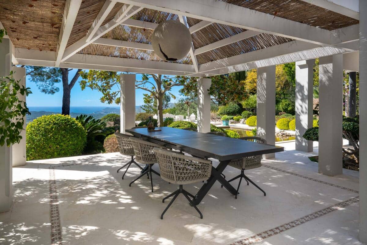 La zona exterior ofrece varias terrazas, parcialmente cubiertas, con cocina y comedor al aire libre, acogedores rincones de estar y una piscina de agua salada.