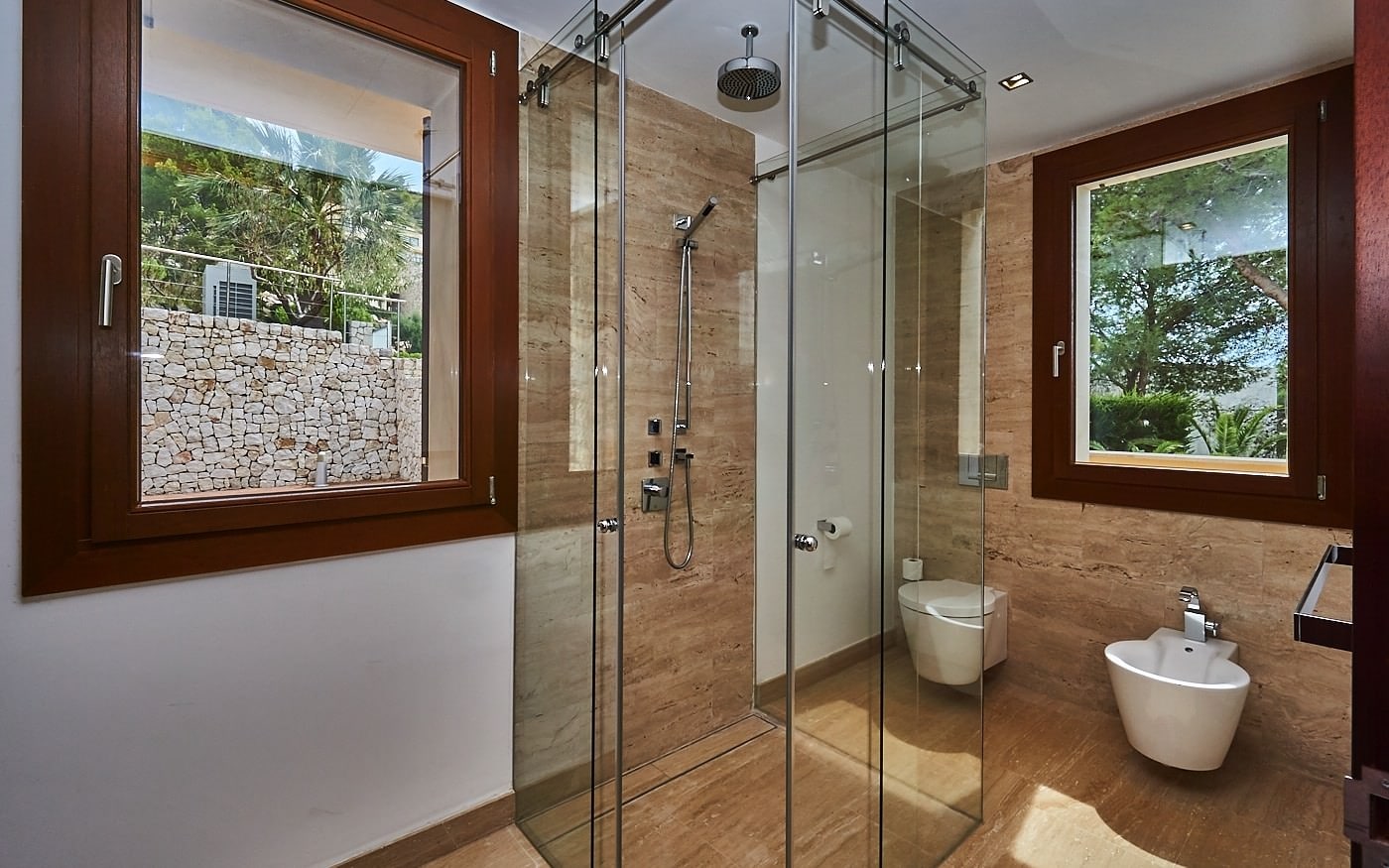 Esta villa tiene cinco dormitorios, cada uno con su propio baño. La cocina está totalmente equipada con electrodomésticos Siemens y una nevera Liebherr con enfriador de vino. Además del comedor y la sala de estar, esta lujosa propiedad también cuenta con un estudio, un vestidor y un gran almacén. Disfrute del jardín y de la piscina con su techo de cristal retráctil y su maravillosa cascada. La piscina de 40 m² está perfectamente integrada en el jardín y rodeada de grandes terrazas y verandas de teca. El chalet de lujo totalmente automatizado en Canyamel está terminado y equipado con un alto nivel.