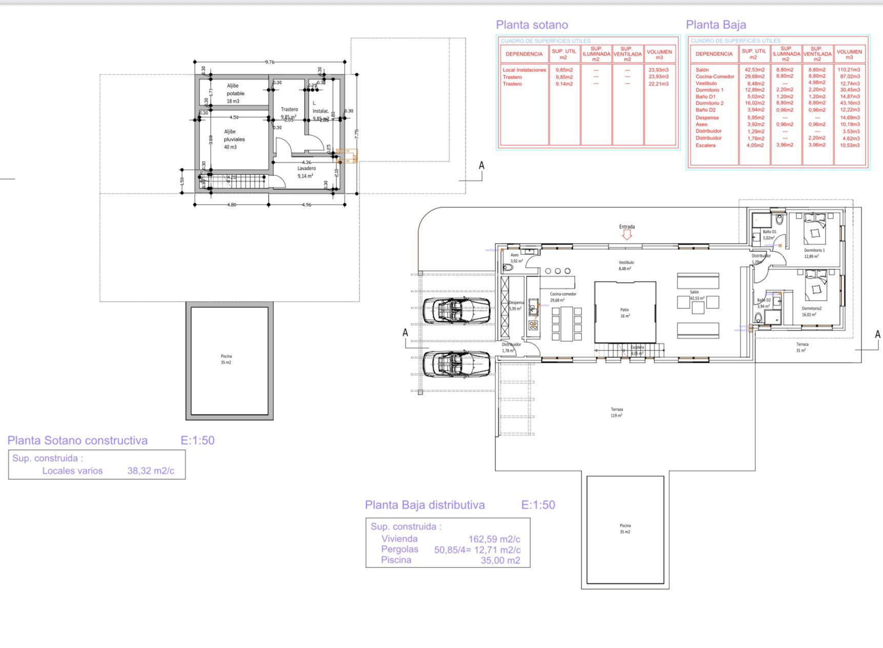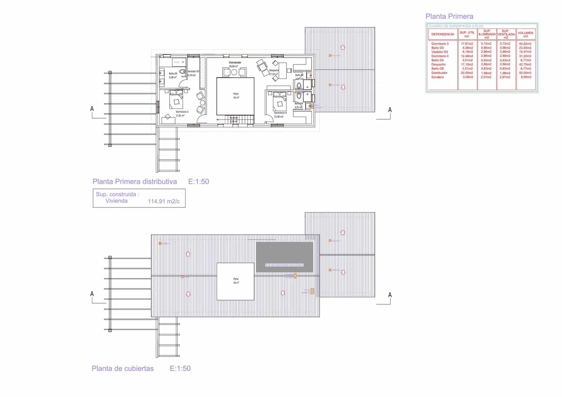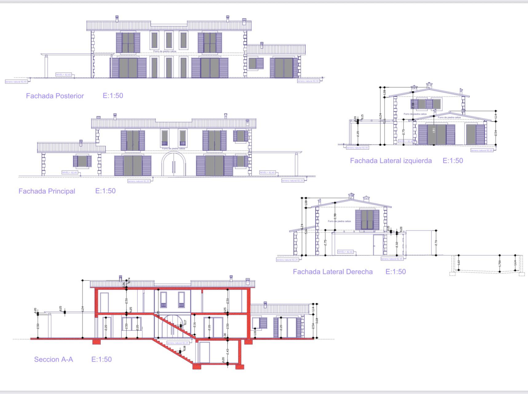 En el proyecto básico se ha presentado una finca de 5 dormitorios con baños en suite, por lo que aún puede diseñar la distribución de las habitaciones. Los planos también incluyen un amplio salón-comedor con cocina americana.