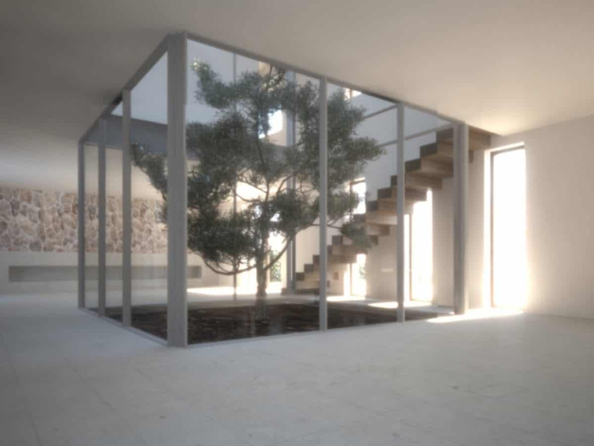 El salón está separado del comedor por un patio acristalado, que invita a relajarse en un ambiente acogedor bajo un olivo.