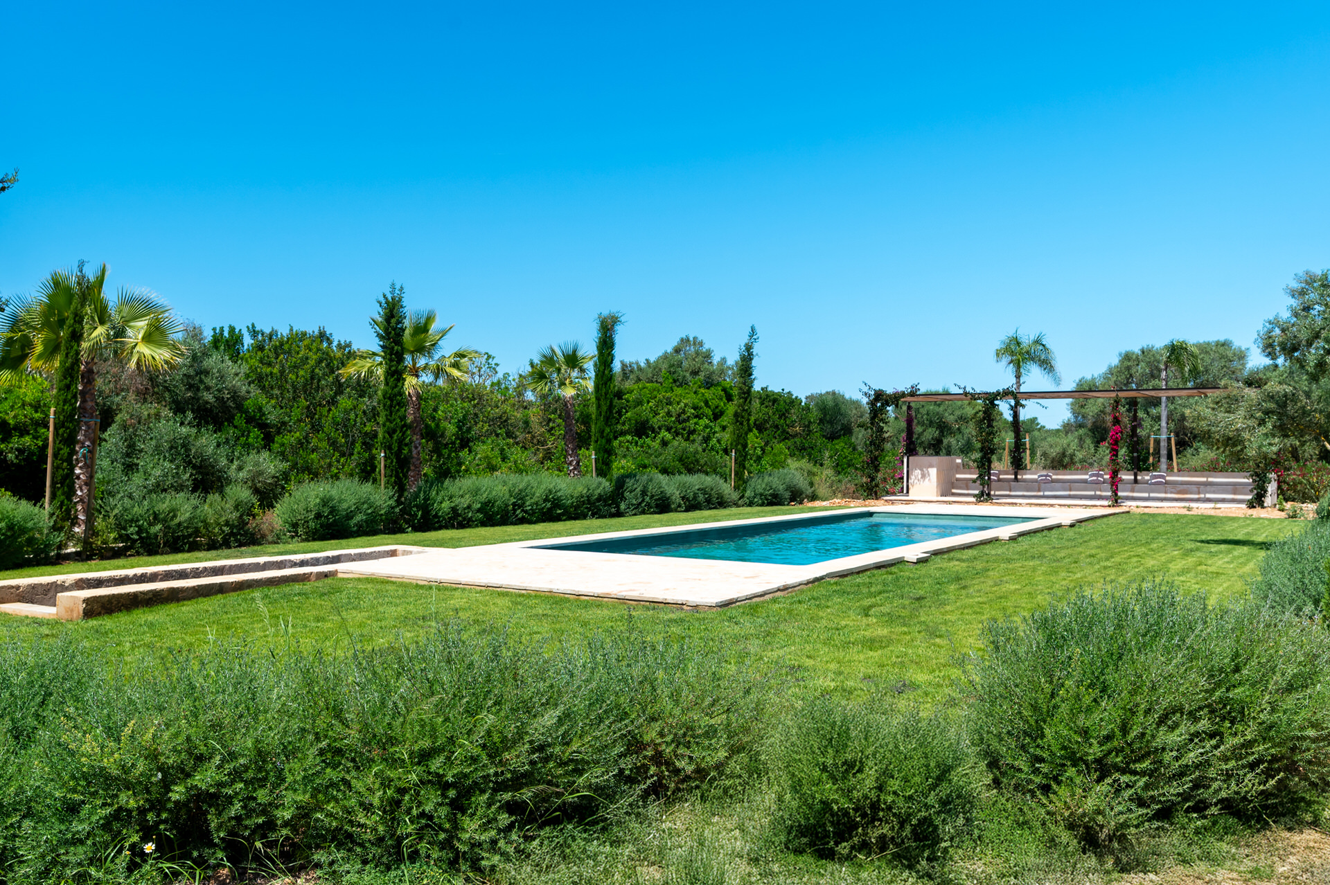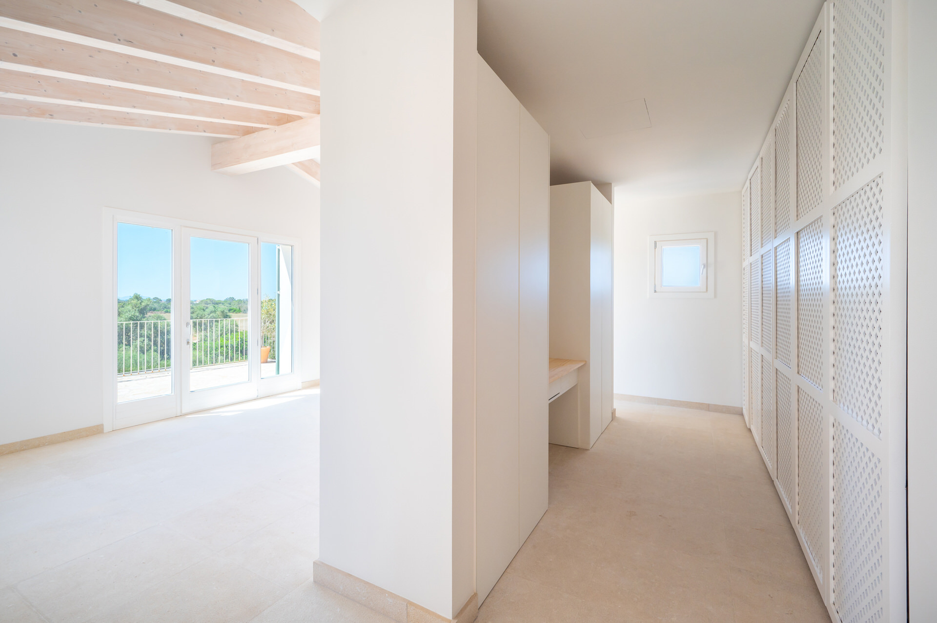 Esta finca de ensueño de piedra de nueva construcción se encuentra en Sa Rapita, cerca de la popular playa de Es Trenc y ofrece privacidad absoluta y una maravillosa vista de la naturaleza circundante hasta el mar.