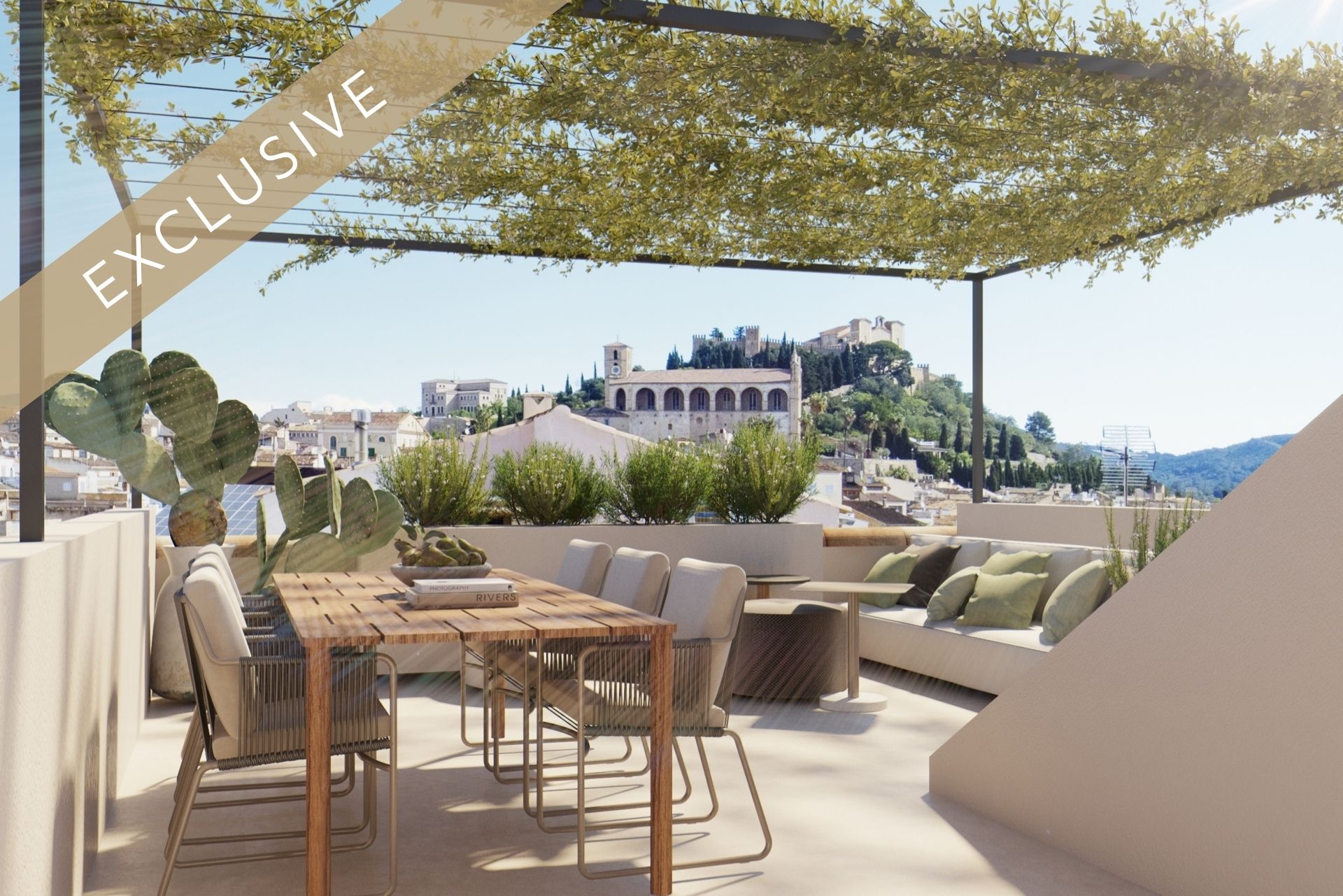 El dormitorio principal, también con baño en suite y vestidor integrado, conduce a la amplia terraza de la azotea con maravillosas vistas de Sant Salvador.