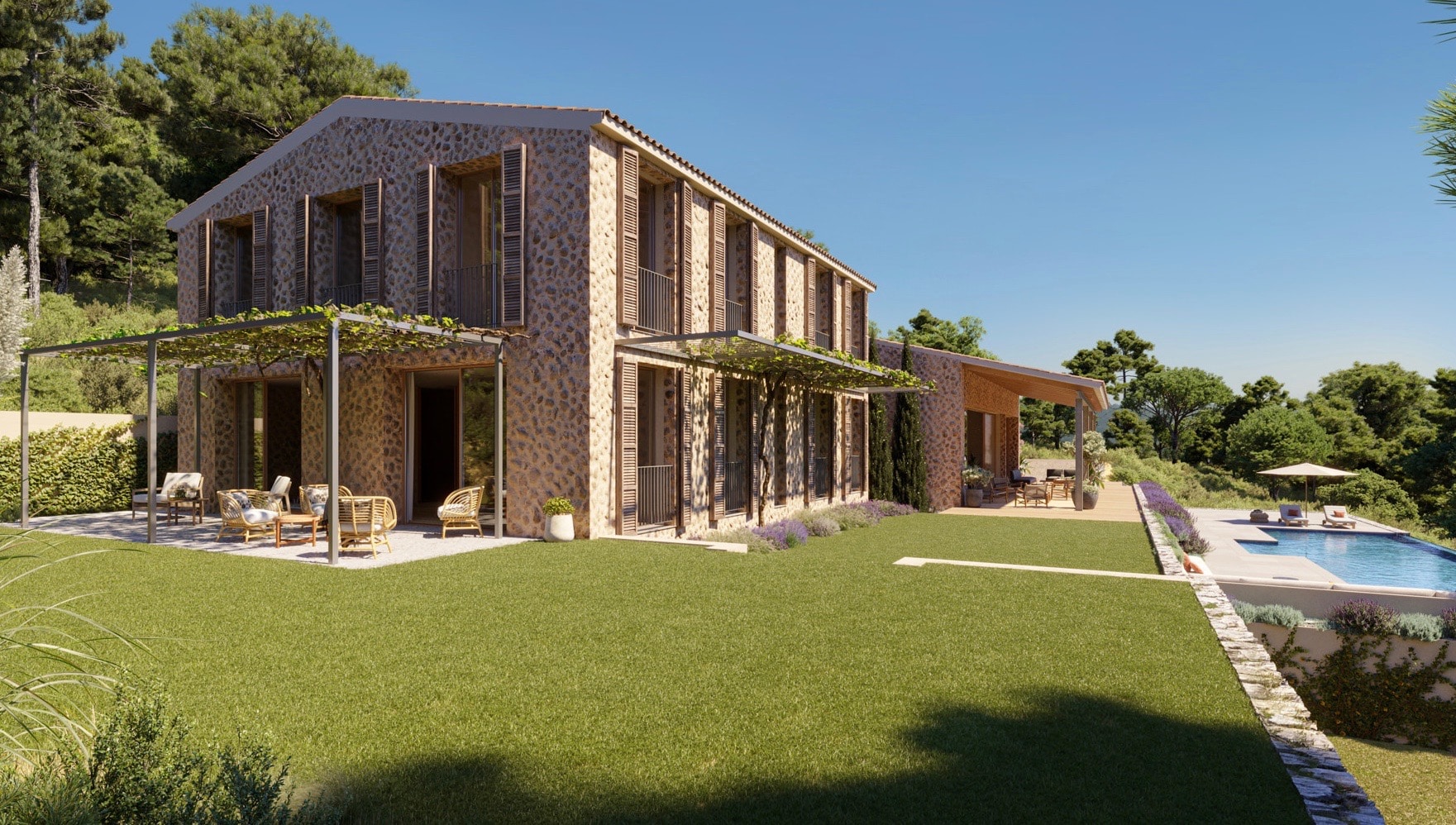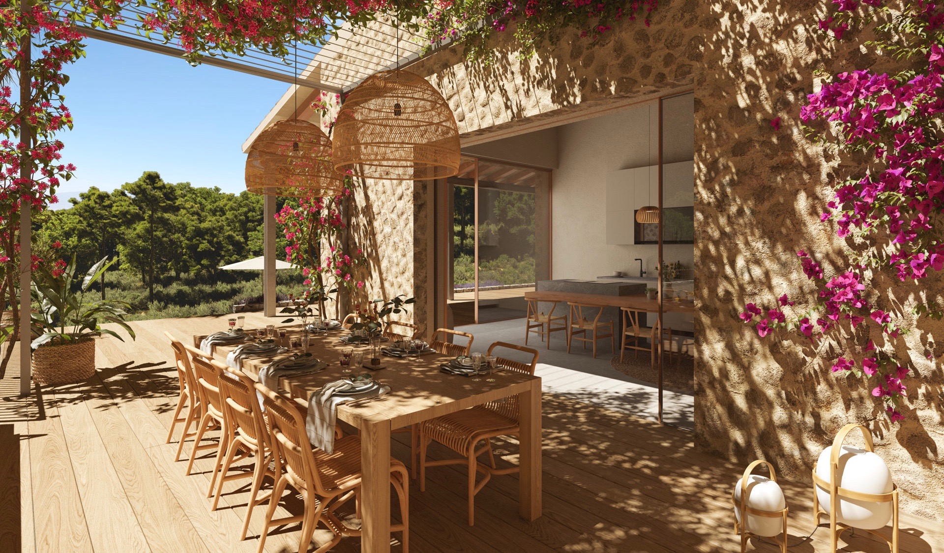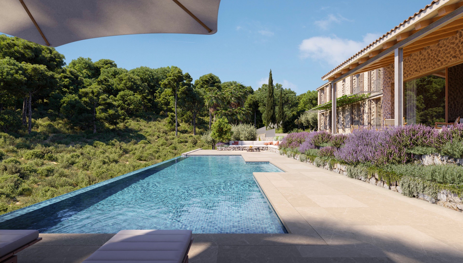 Esta excepcional villa de lujo de nueva construcción se encuentra en una colina que ofrece una vista impresionante en la distancia. La parcela de aprox. 33.280 m² se encuentra en una zona privada de Santa María y está rodeada exclusivamente de naturaleza, lo que garantiza una privacidad absoluta.