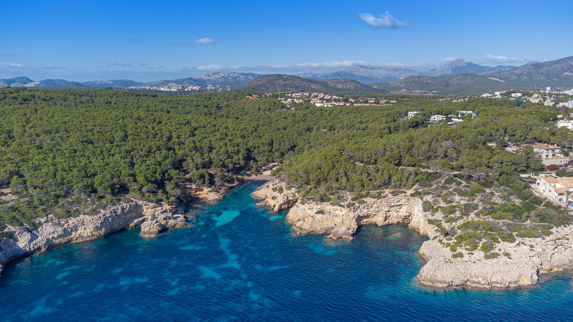 Vivir en Cala Vinyas, en el municipio de Calvià, tiene un gran encanto. Cala Vinyas es un pequeño pueblo del suroeste de Mallorca, enclavado en bosques de pinos y rodeado de escarpados acantilados. Senderos en un lugar tranquilo, así como pequeñas calas de baño son características especiales de este lugar situado en el suroeste de Mallorca. Debido a la buena infraestructura, así como a la proximidad a la capital Palma de Mallorca, Cala Vinyas promete una exitosa mezcla de ensoñación rural y una vida a pulso. La mayoría de los visitantes de la bahía de Cala Vinyas aprecian el aislamiento de este tramo de costa alejado del bullicio del turismo de masas. Sin embargo, Cala Vinyas no se pierde en la soledad rural: Atracciones como los puertos deportivos de Puerto Portals y Port Adriano, así como los campos de golf de Santa Ponsa y Poniente están al alcance de la mano. La ciudad más cercana es Magaluf, que está a unos tres kilómetros al sur de Cala Vinyes. La playa de arena ofrece un ambiente tropical con sus palmeras y el Chiringuito directamente en la playa (bar de playa), que está abierto en verano, es también muy popular entre los lugareños. Además, la playa se adentra muy poco en el mar, por lo que también es muy adecuada para los niños. Justo detrás de la playa hay un parque infantil donde los niños pueden divertirse más. La bahía de Cala Falco con el Club de Playa de Cap Falco, que está a sólo unos minutos de distancia, es muy popular entre los lugareños, así como los propietarios de segundas viviendas y los turistas. Con sólo 40 metros de longitud y sin hoteles ni tiendas de ningún tipo, esta playa única es un lugar ideal para escapar de los concurridos centros turísticos cercanos, como Magaluf o Palmanova.