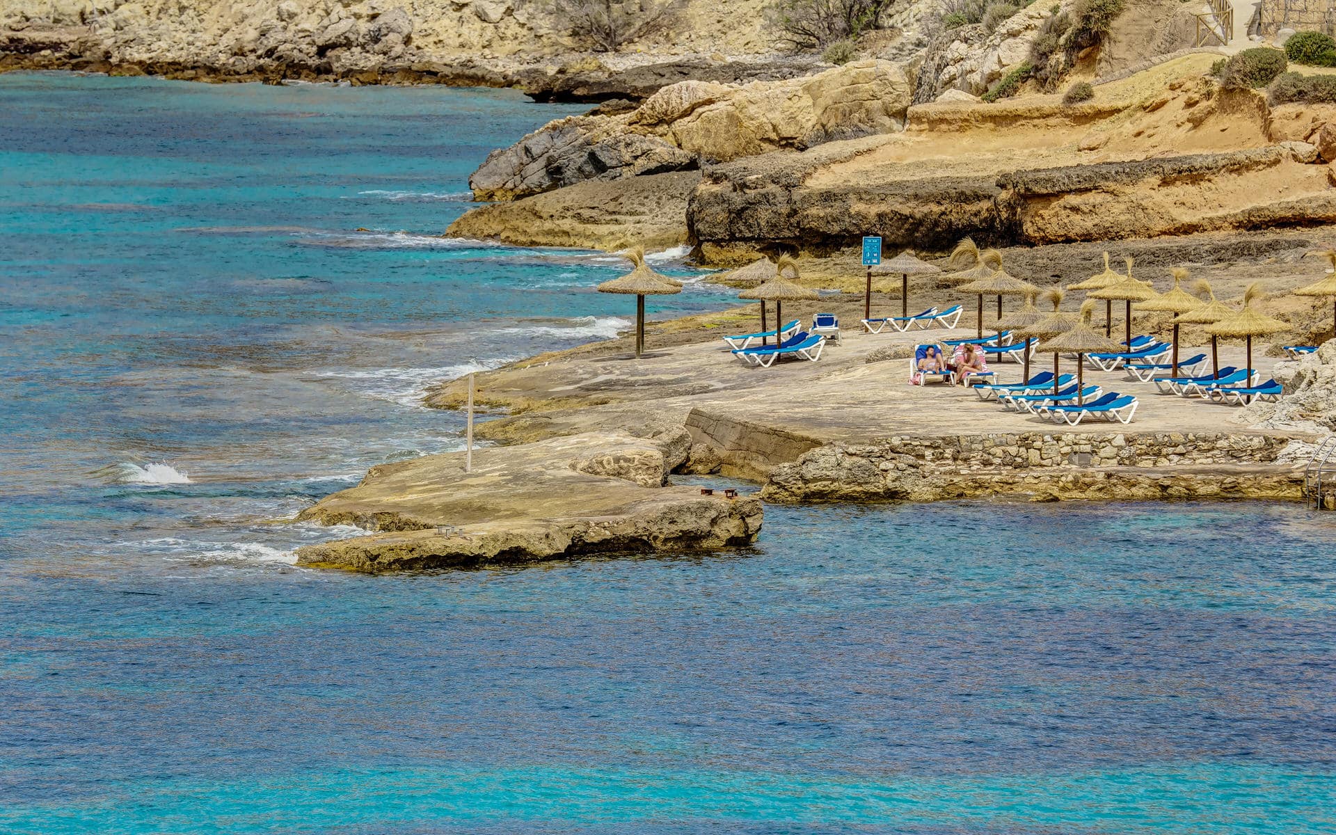 Entre Palma y Andratx se encuentra el tranquilo pueblo de Costa de la Calma. Pertenece a Santa Ponsa y se encuentra en la costa suroeste de Mallorca. Su nombre significa «costa de la tranquilidad» y eso es exactamente lo que aprecian los aproximadamente 1000 habitantes y turistas de esta zona. Aquí no hay grandes complejos hoteleros, la imagen se caracteriza por numerosas villas o pequeños hoteles como el Hotel Maritim Galatzo. Especialmente popular entre los turistas, pero también entre los lugareños, es el «Il Chiringuito», que abre en verano. El pequeño chiringuito está situado directamente en las rocas de la bahía de Costa de la Calma, junto a una pequeña playa de arena, y ofrece unas vistas espectaculares del mar y la puesta de sol. Se pueden alquilar tumbonas, la entrada al mar permite una escalera y la cocina es sencilla pero ofrece algunos aperitivos para el poco hambre que hay.