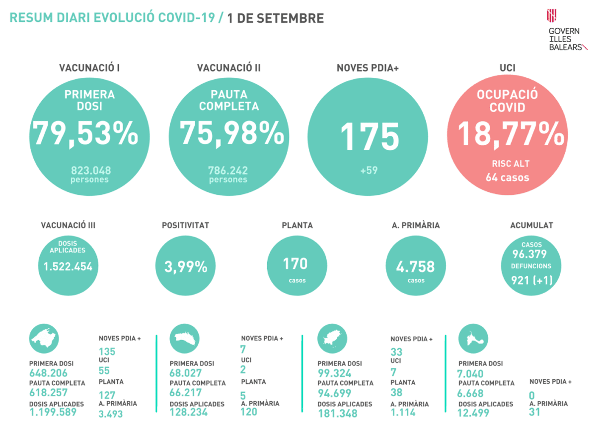 El gobierno regional de Mallorca y las islas vecinas comunicaron a Madrid 175 nuevos contagios de coronavirus en las últimas 24 horas del miércoles 1 de septiembre (día anterior: 116)