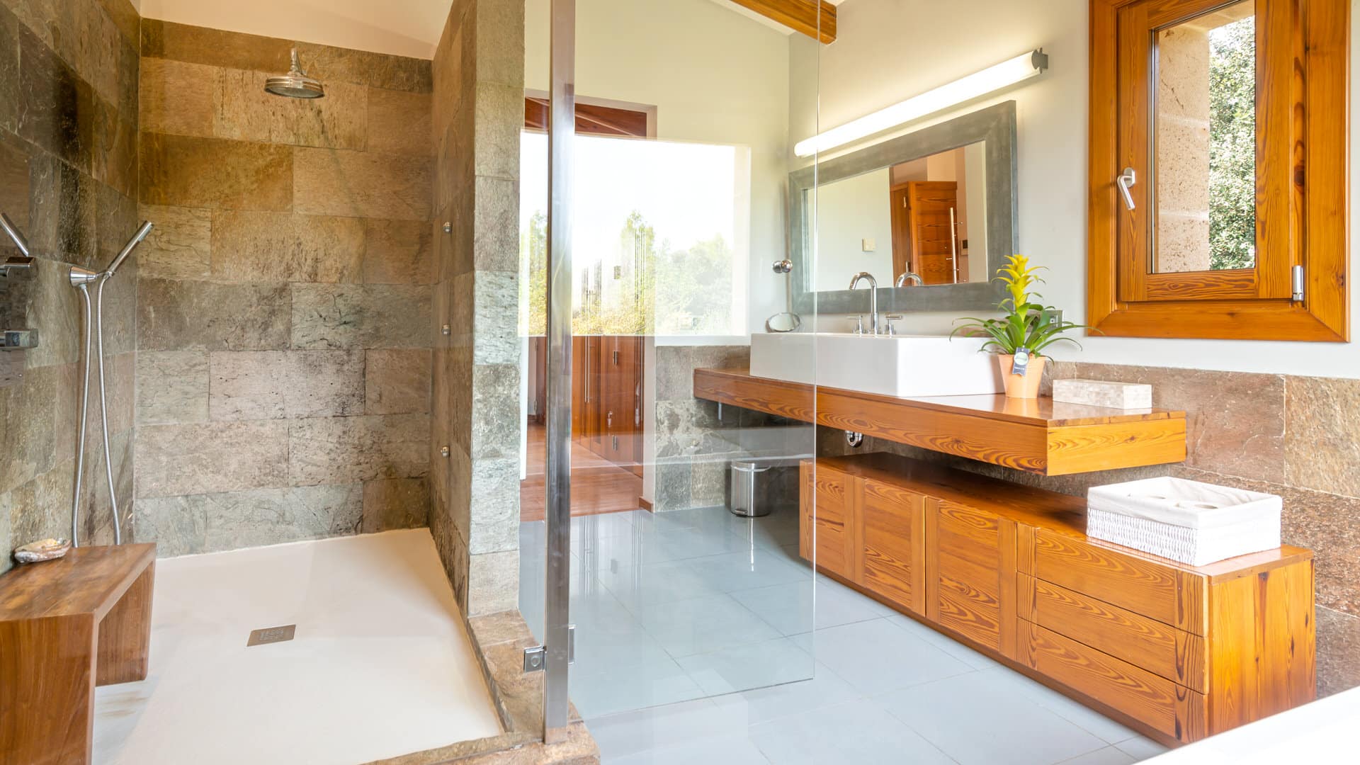 Nur wenige Treppen aufwärts befinden sich zwei weitere Schlafzimmer mit Badezimmer en suite. Das Hauptschlafzimmer finden Sie auf der ersten Etage. Es verfügt ebenfalls über ein Badezimmer en suite, einen Ankleideraum und eine eigene Terrasse mit fantastischem Panorama-Weitblick.
