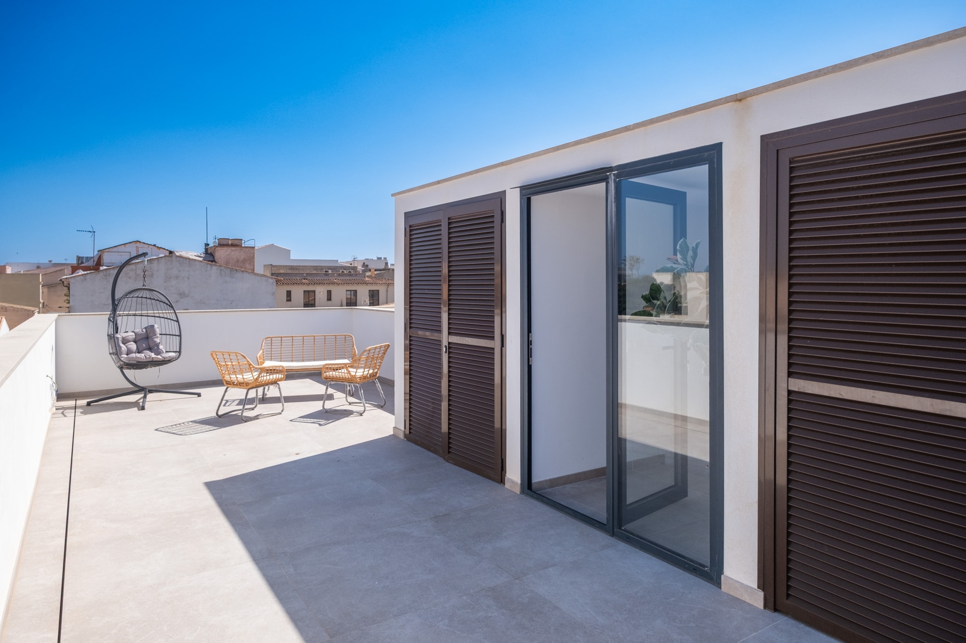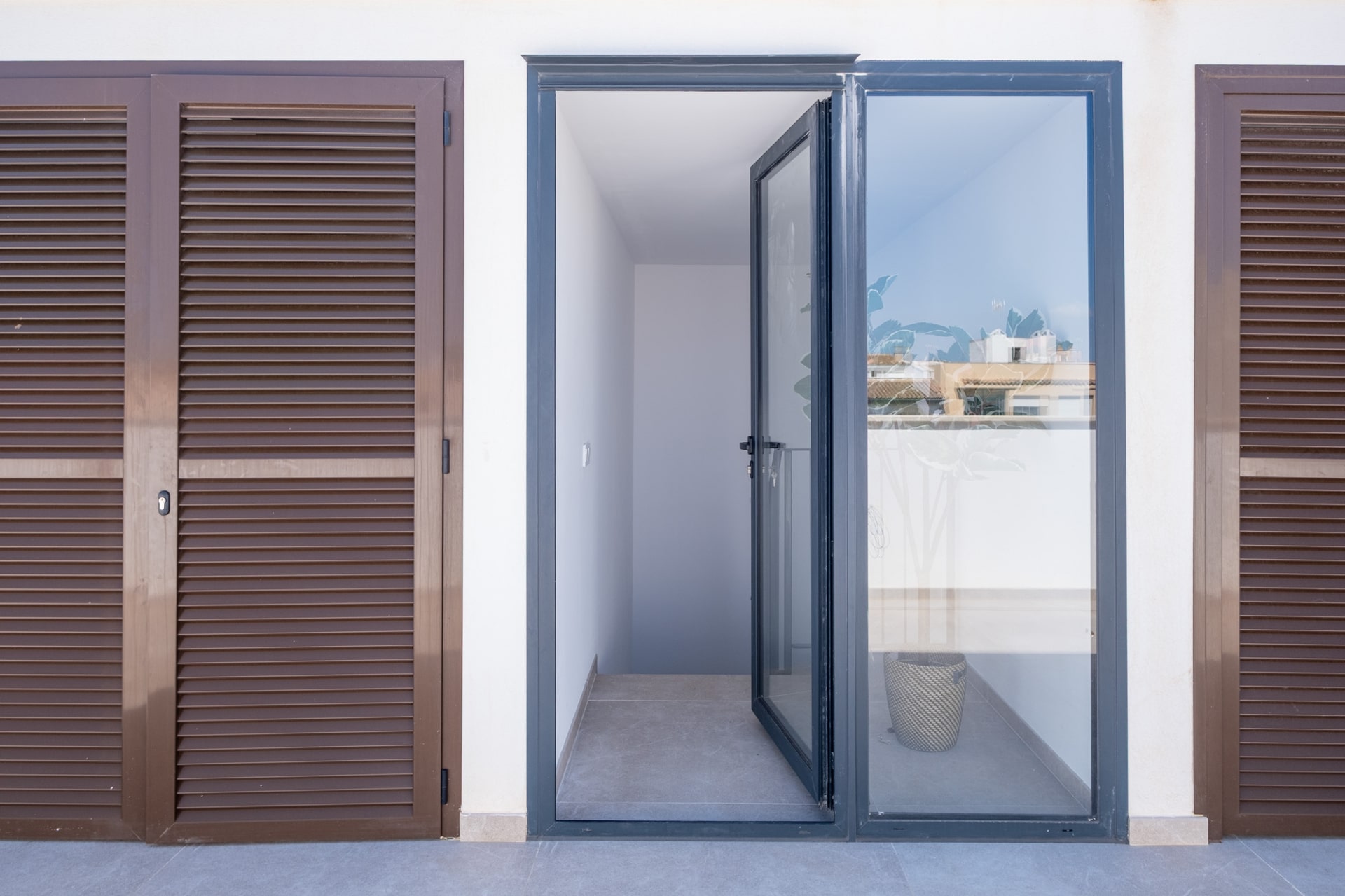 Die bodentiefen Fenster- und Türelemente aus Aluminium mit Mallorquinischen Klappläden