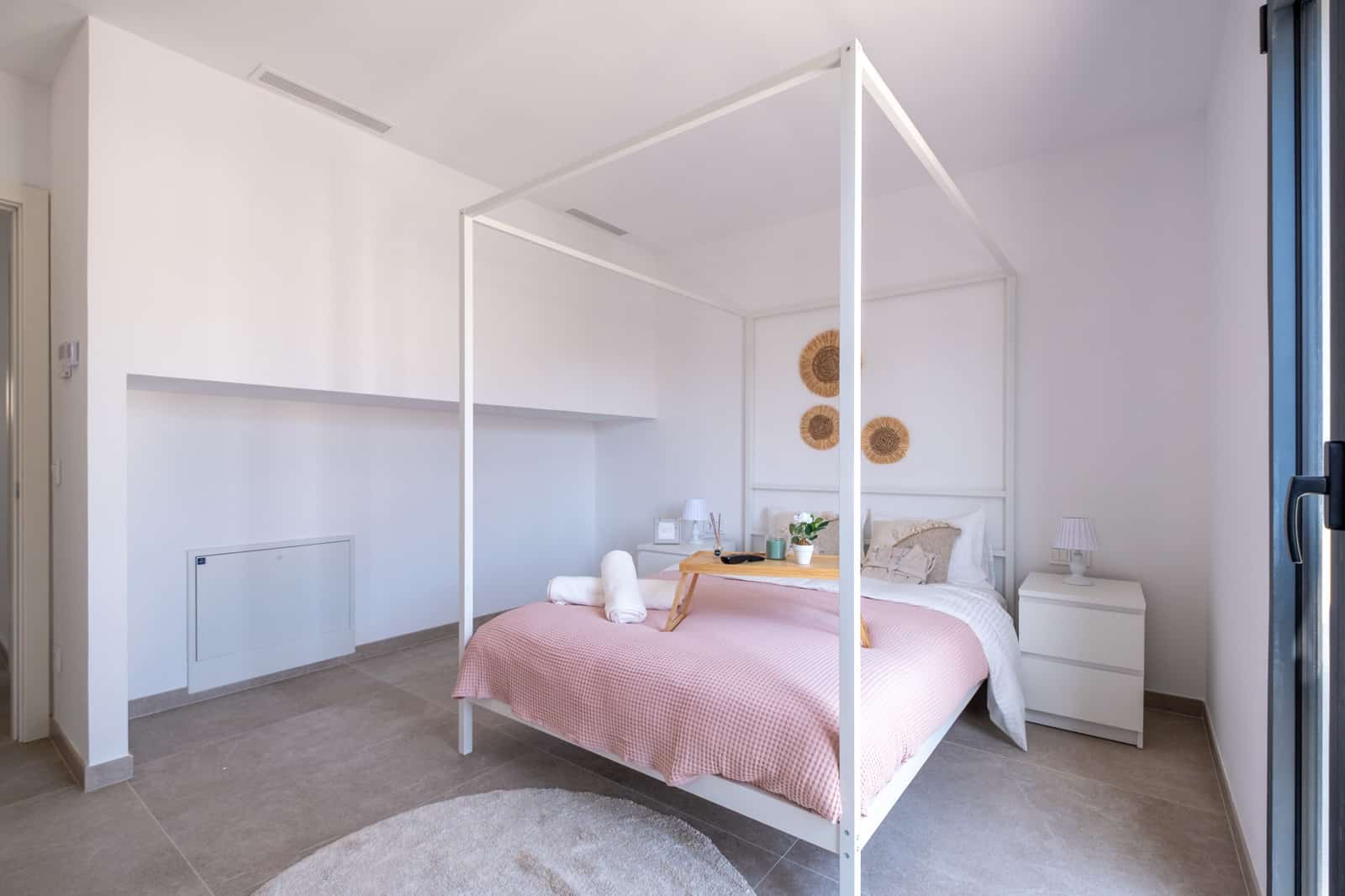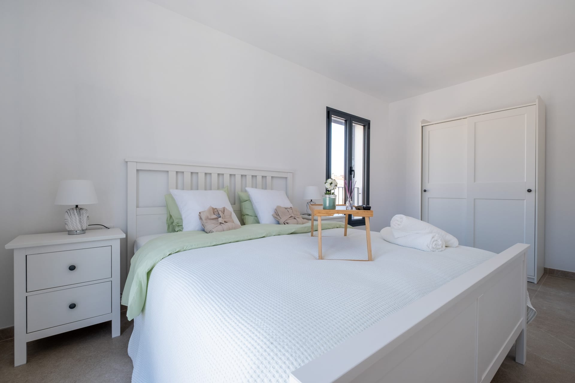 Im Innenbereich erwarten Sie großformatige Natursteinböden (Caliza Sinai), glatte Decken,