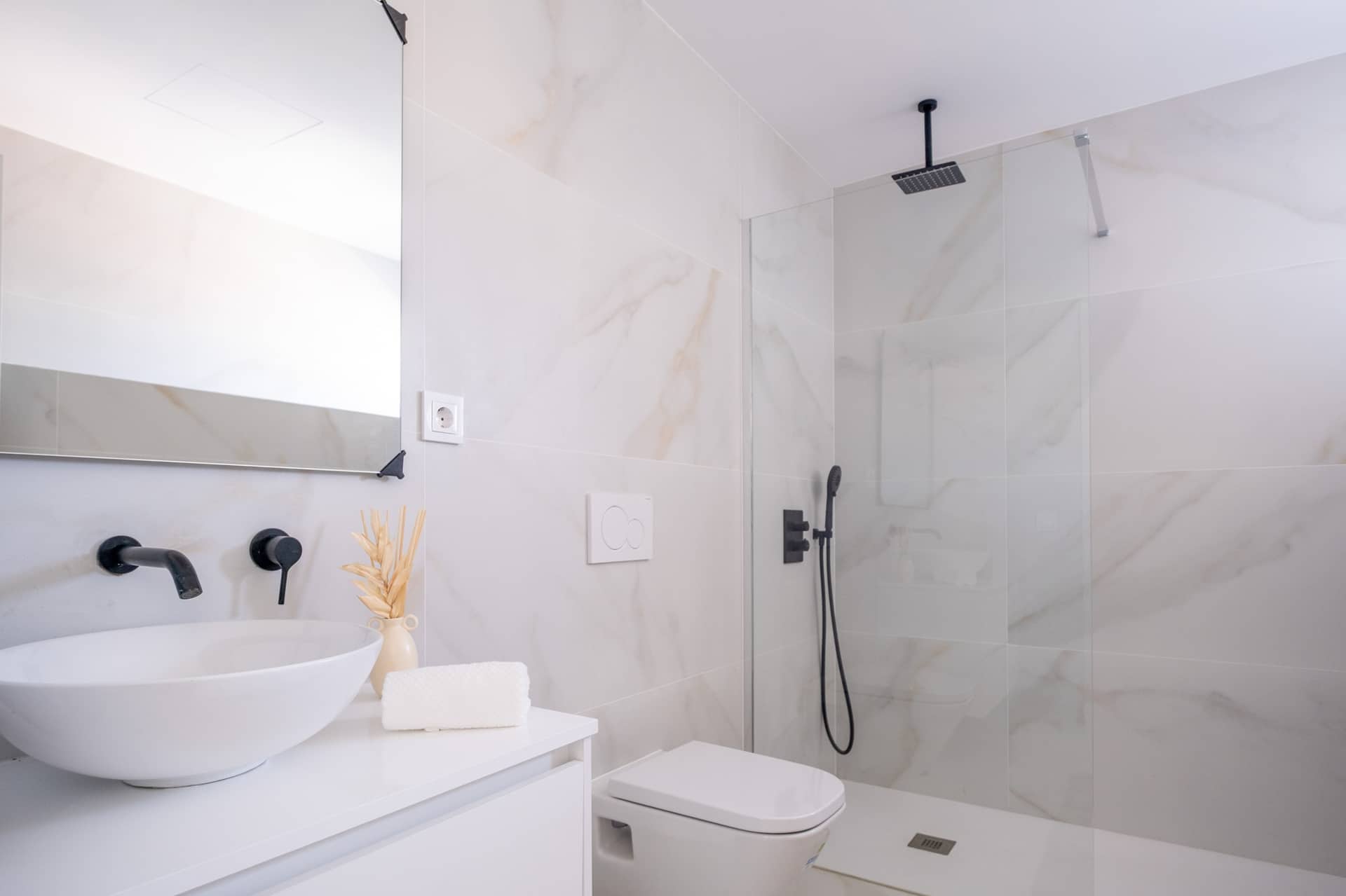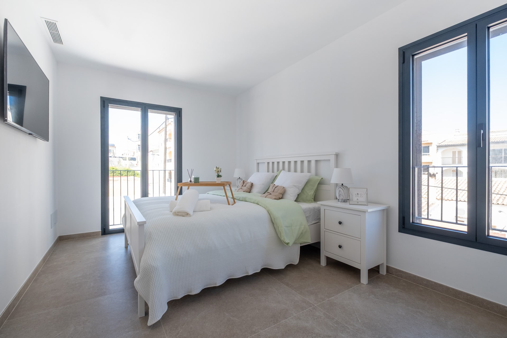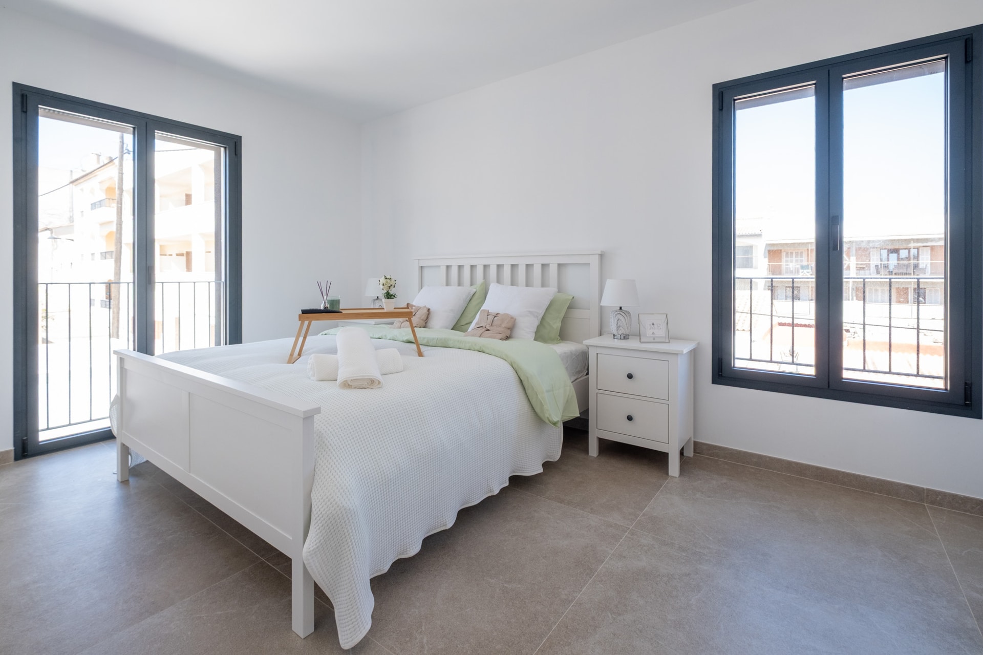 Großformatige Natursteinfliesen, lackierte Innentüren, Fenster im Holzdesign mit mallorqui-
