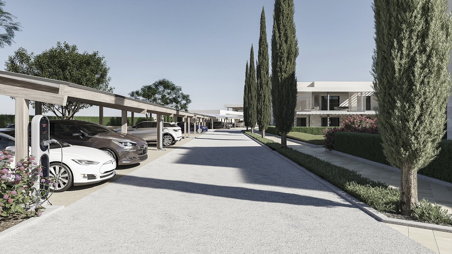 Ein Carport und ein Abstellraum sind diesem Apartment zugehörig. Die Gemeinschaftsanlage bietet außerdem ein Fitnessstudio und eine Lademöglichkeit für Elektrofahrzeuge.