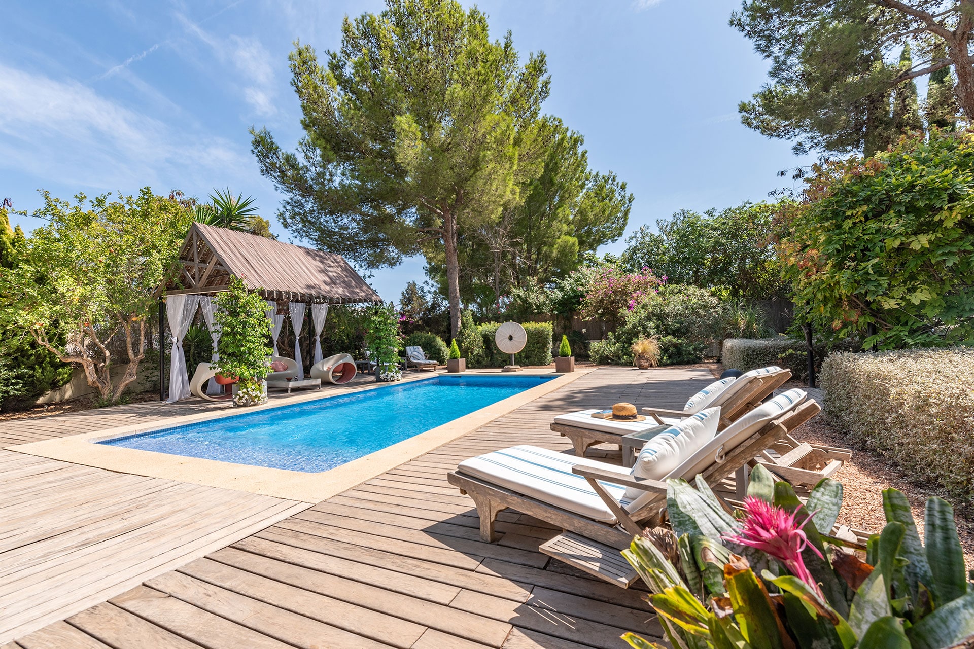 Im Außenbereich gibt es offene und überdachte Terrassen welche einen Salzwasser Swimmingpool, eine Pergola, einen Boule-/Petanca-Platz, Springbrunnen, Rosenbeete, Obstbäume und einen Kakteengarten umfassen.