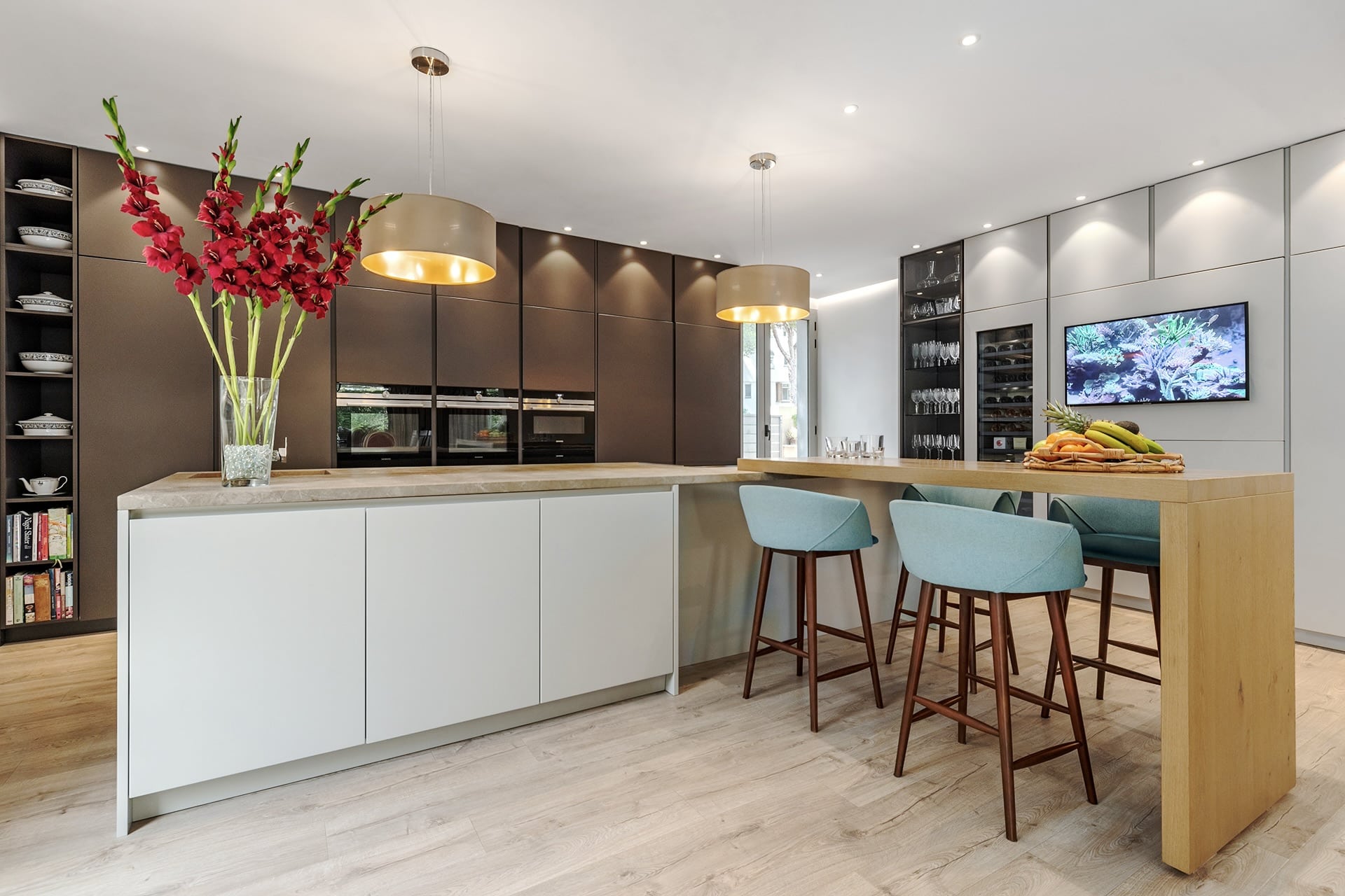 Die italienische Designerküche der Spitzenklasse verfügt über Siemens-Geräte und einen Gaggenau-Weinkühlschrank für 80 Flaschen, eine separate Speisekammer und einen Hauswirtschaftsraum.