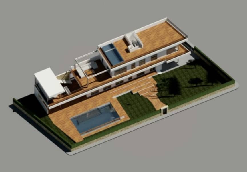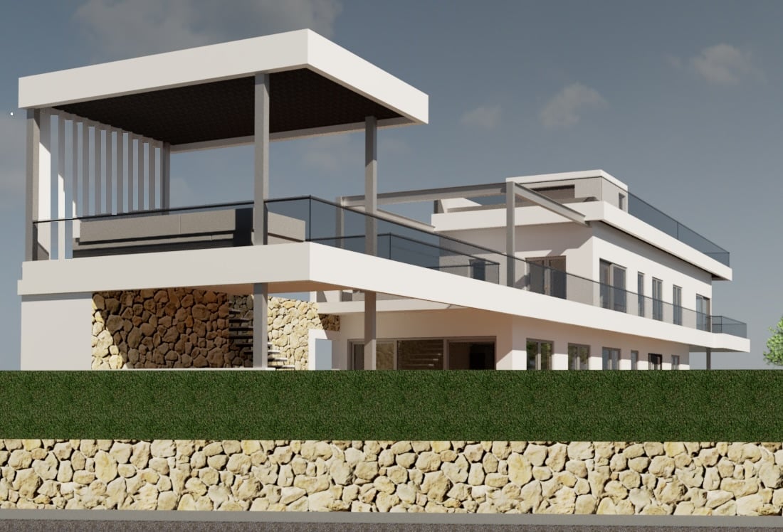 Auf der oberen Etage wird sich das große Hauptschlafzimmer mit Bad en suite und Ankleideraum befinden sowie zwei weitere Schlafzimmer und zwei Bäder. Auch hier wird es eine große Terrasse mit Pergola geben mit einer gemütlichen Lounge und traumhaftem Panoramablick bis hin zum Meer.